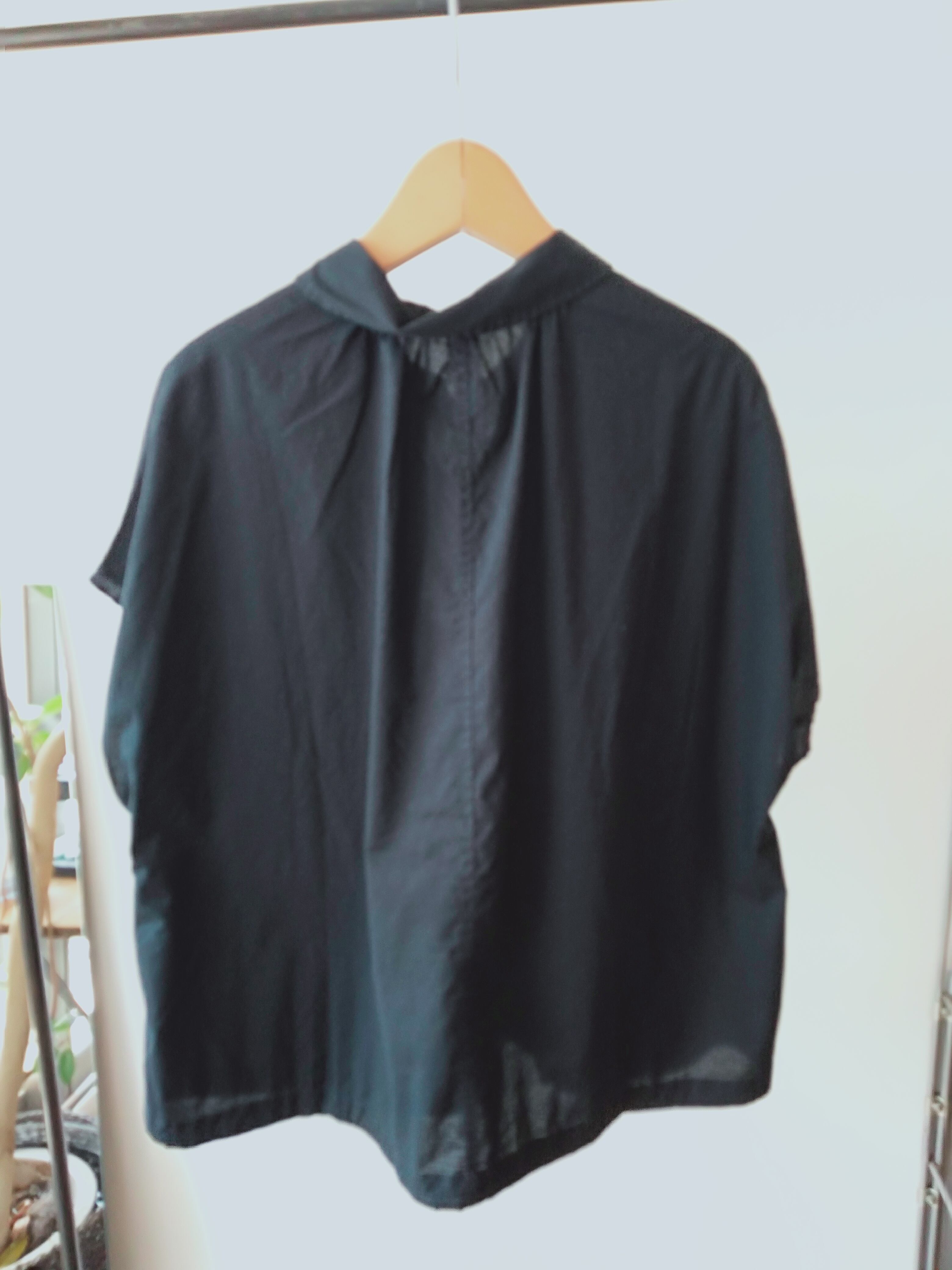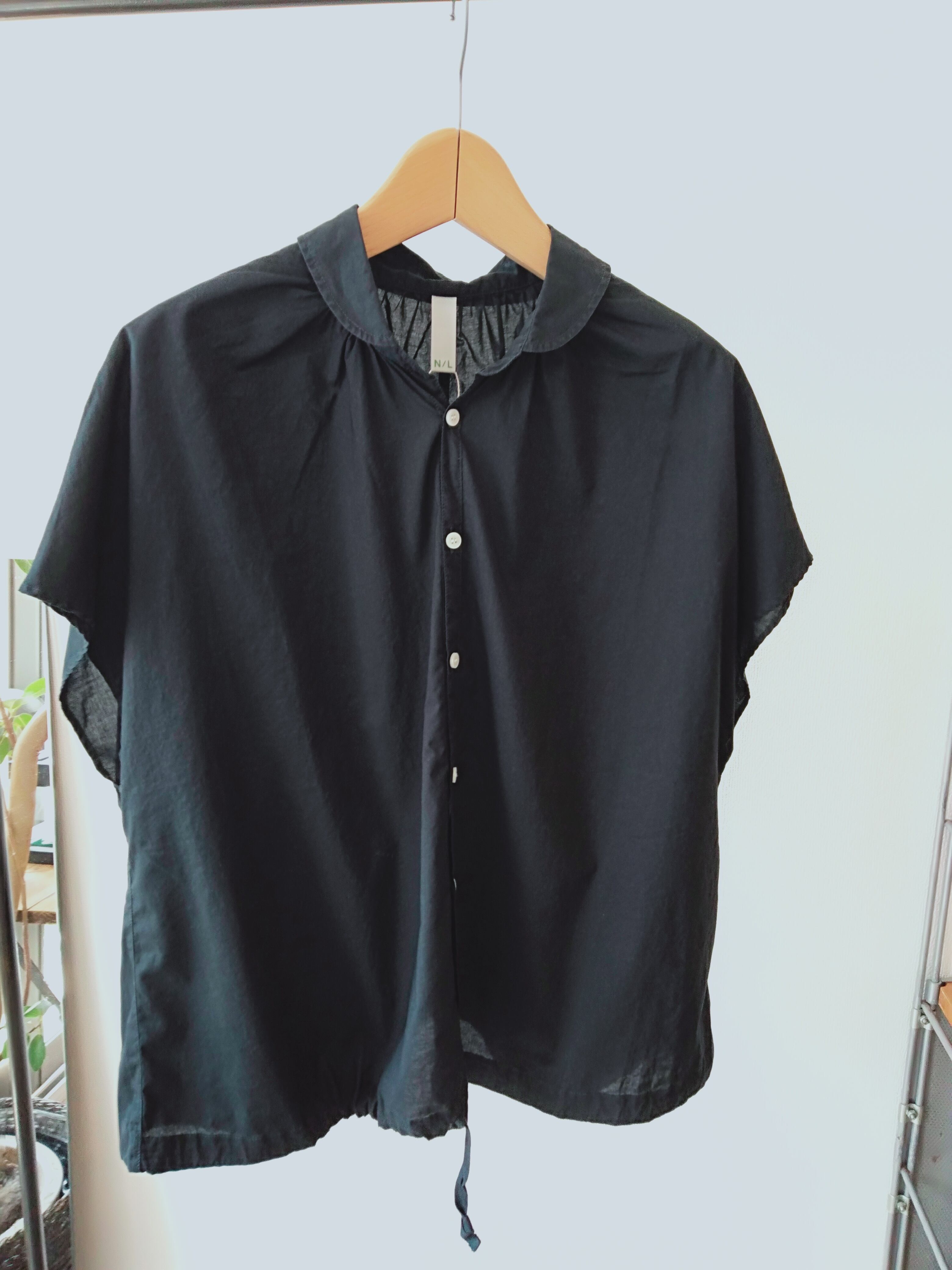 80番手の細い糸を使用したタイプライターです。製品染めにより、雰囲気のある表情を出しています。高密度の生地特有のしなやかなハリがありながらも80の細番手で夏にピッタリな素材です。丸襟、前開き、フレンチスリーブのドローシャツ。裾に入ったドローコードでアレンジができます。
