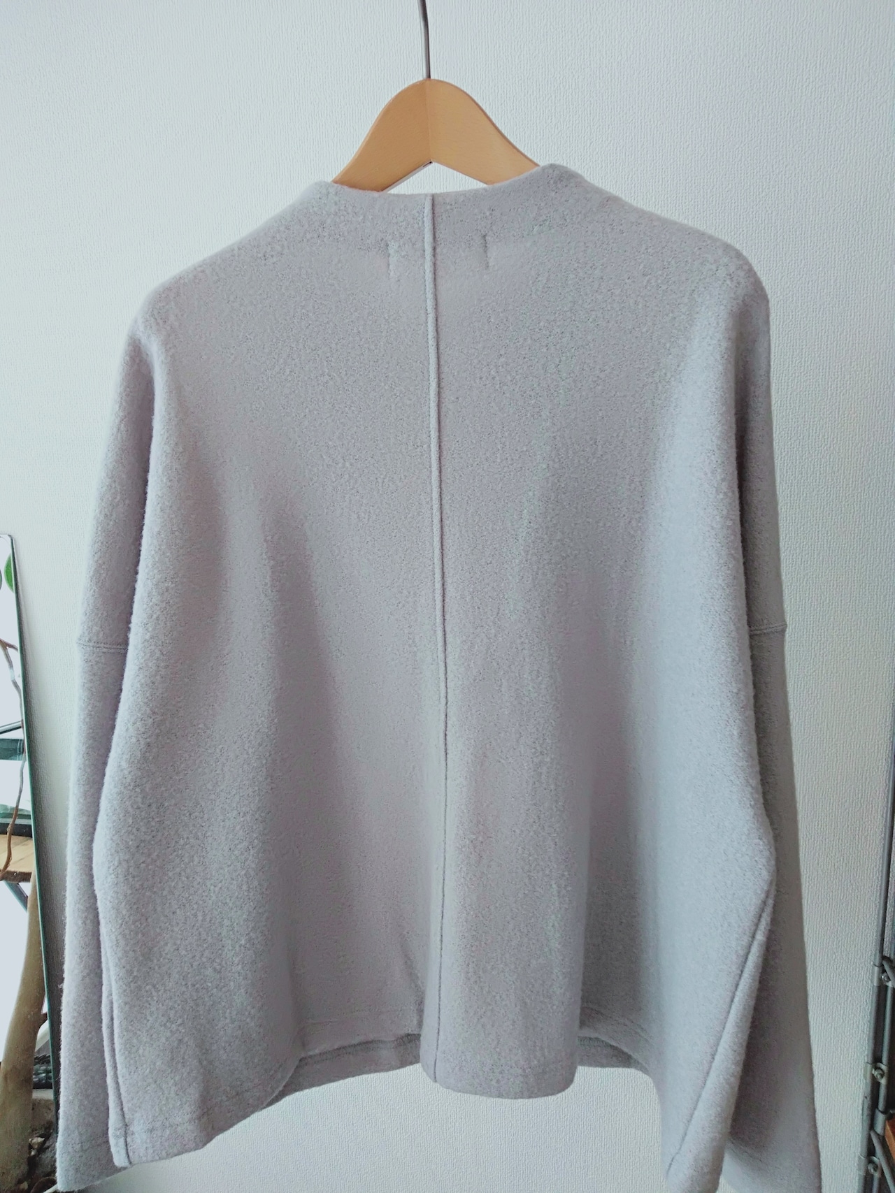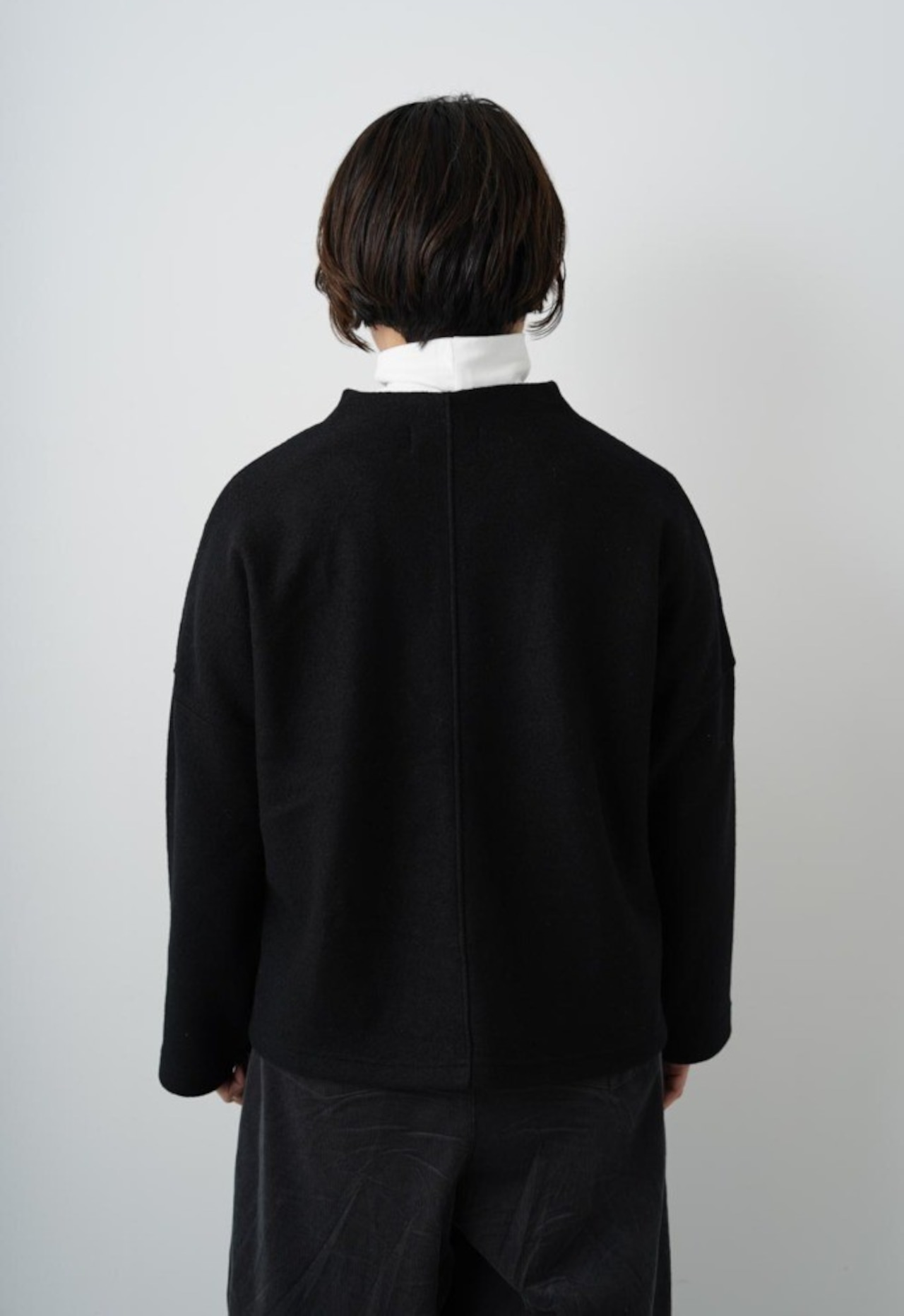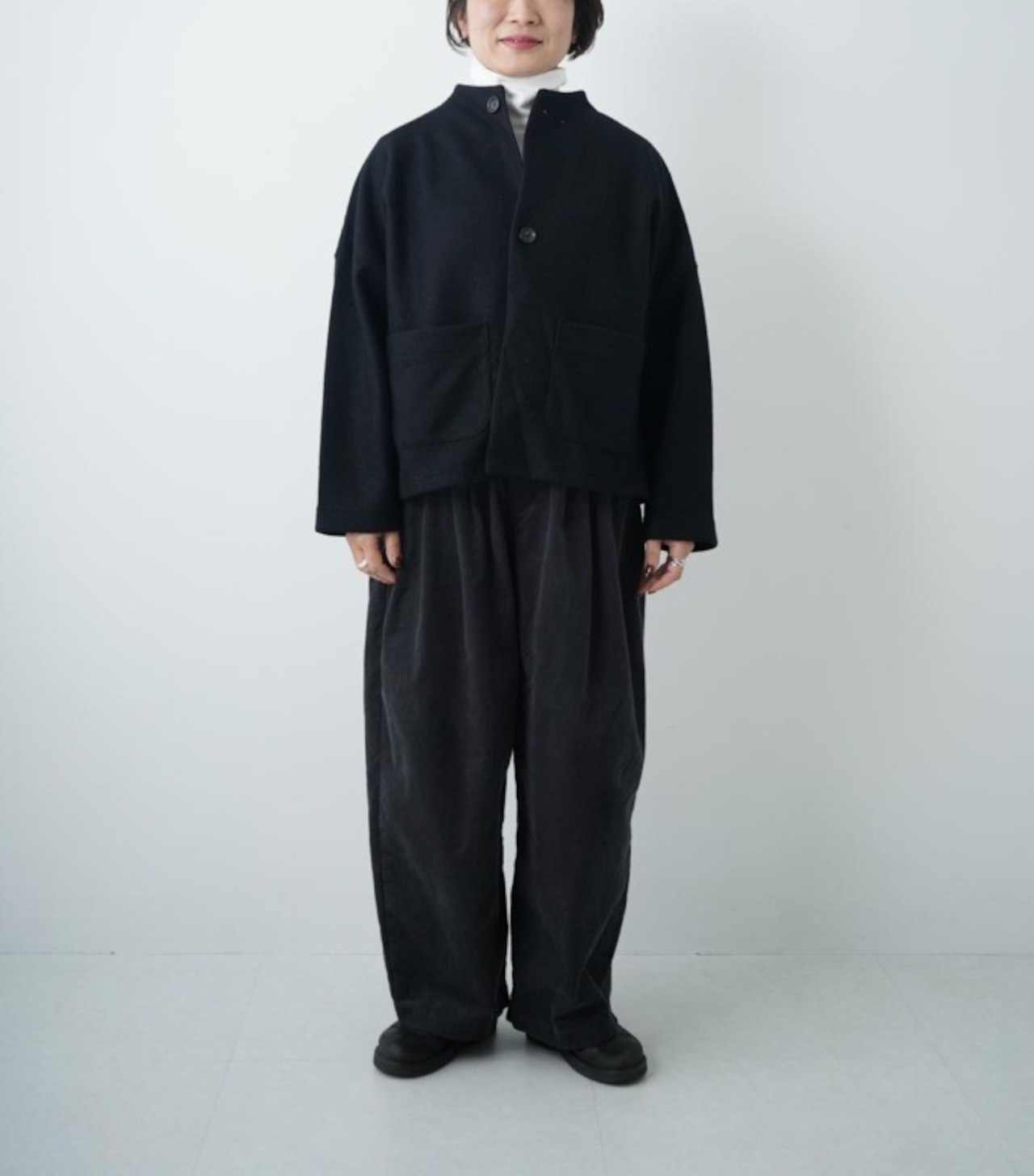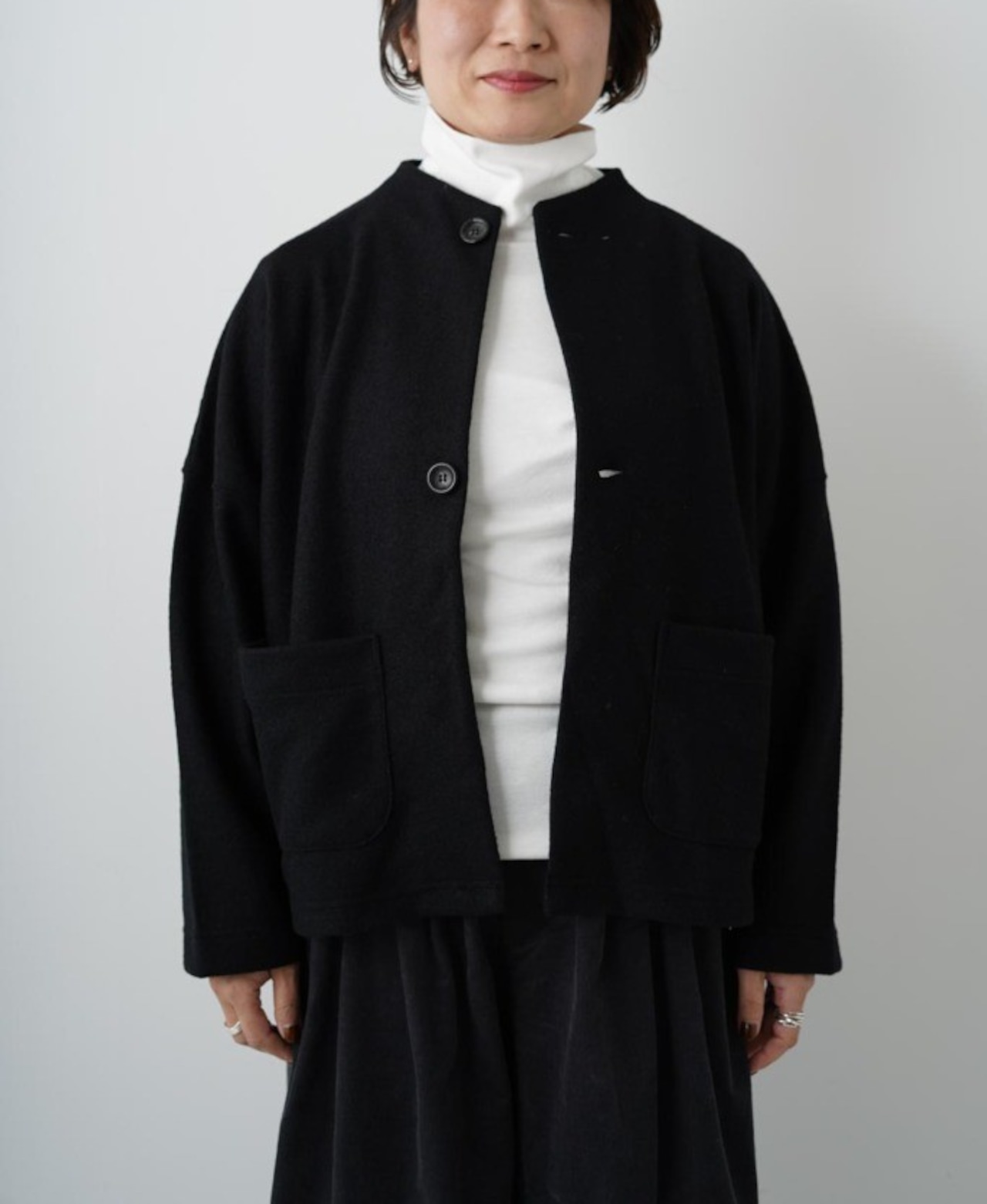 秋冬の定番、圧縮ブークレーより軽いですが、フェルトのように目が詰まってるので風を通さず暖かい着心地です。ウール混率が高いので明るい色も深みがあり上品。ふわふわとした凹凸感もあり秋冬らしい特徴のある素材です。同素材のパンツがあるので、セットアップで着るのがおすすめです。