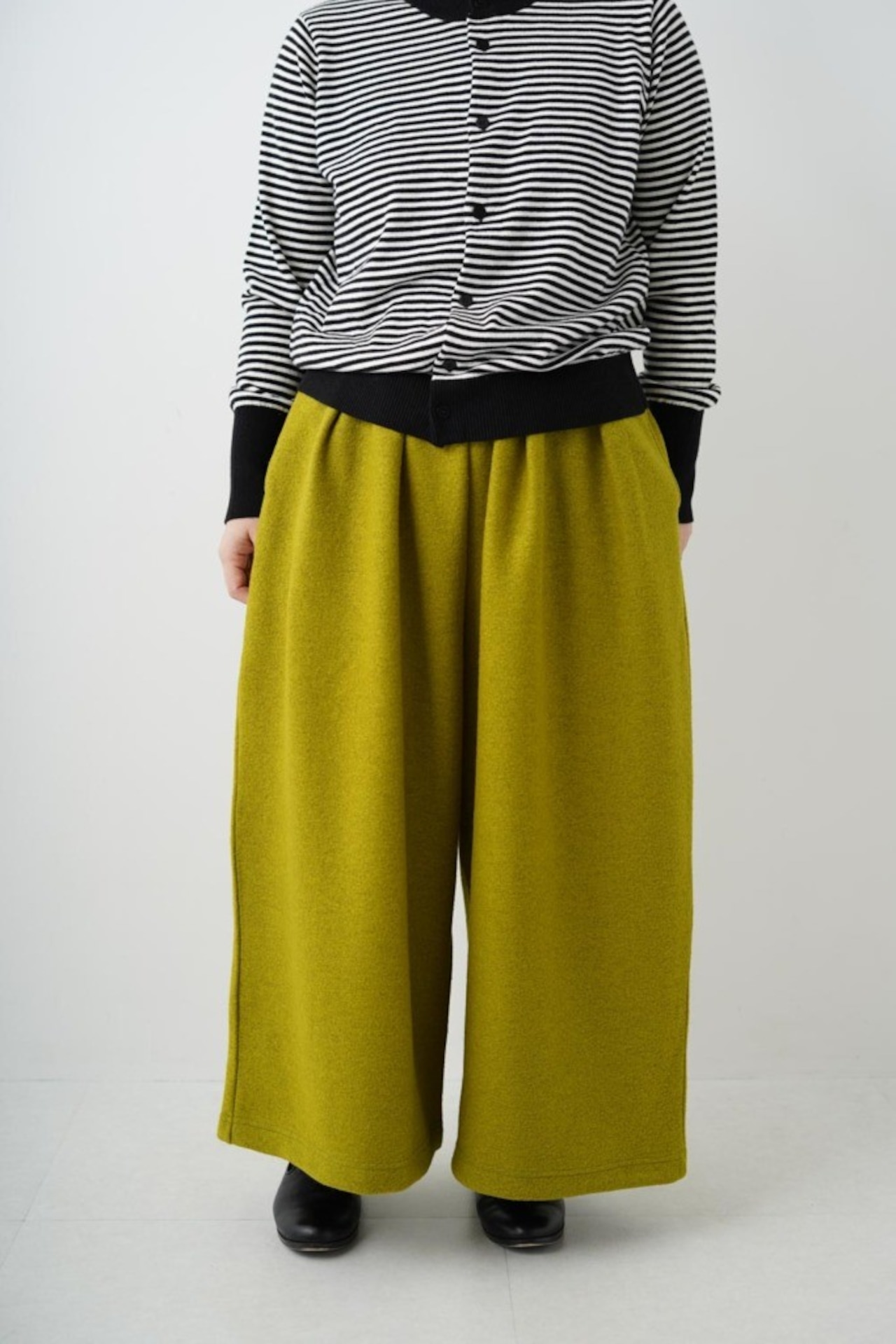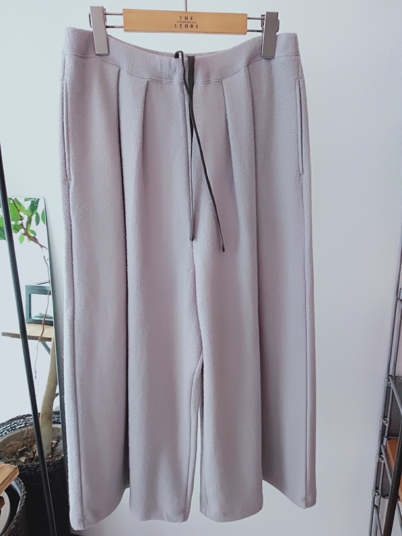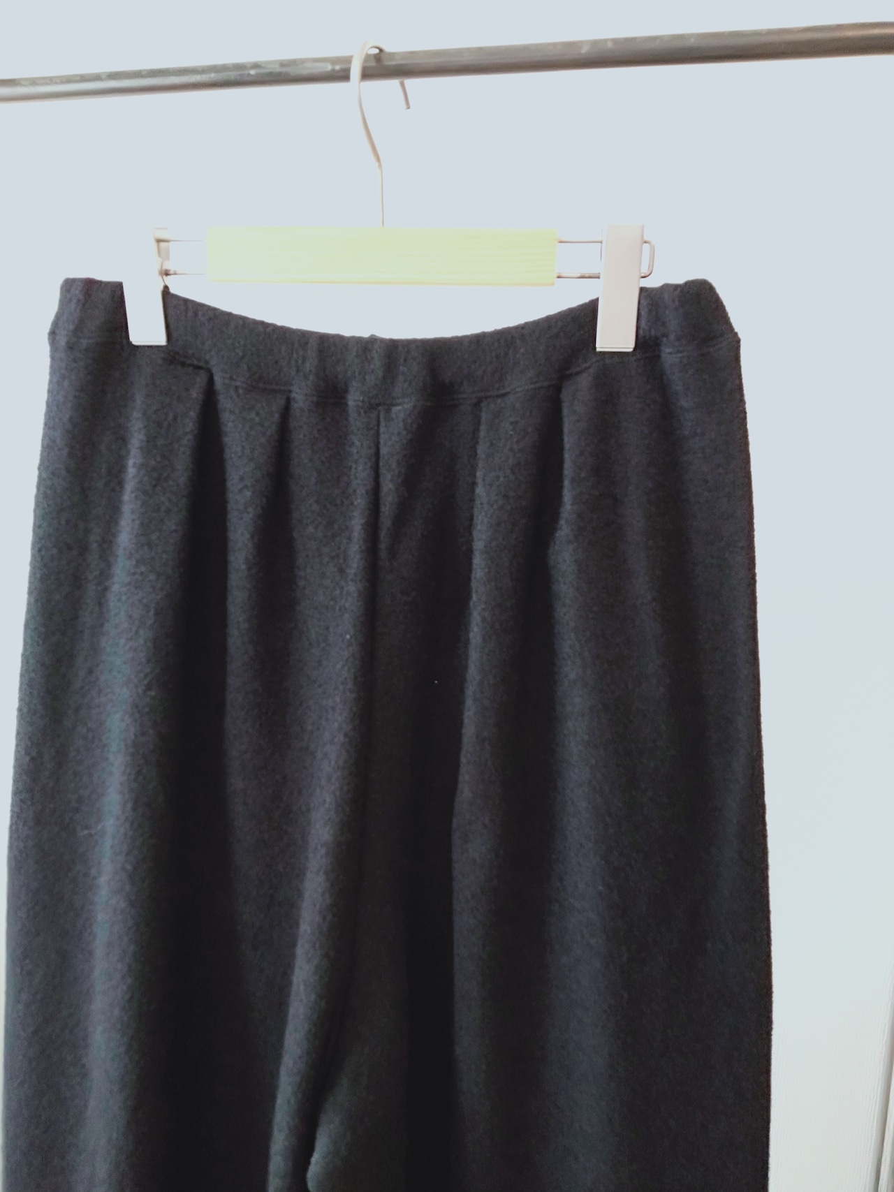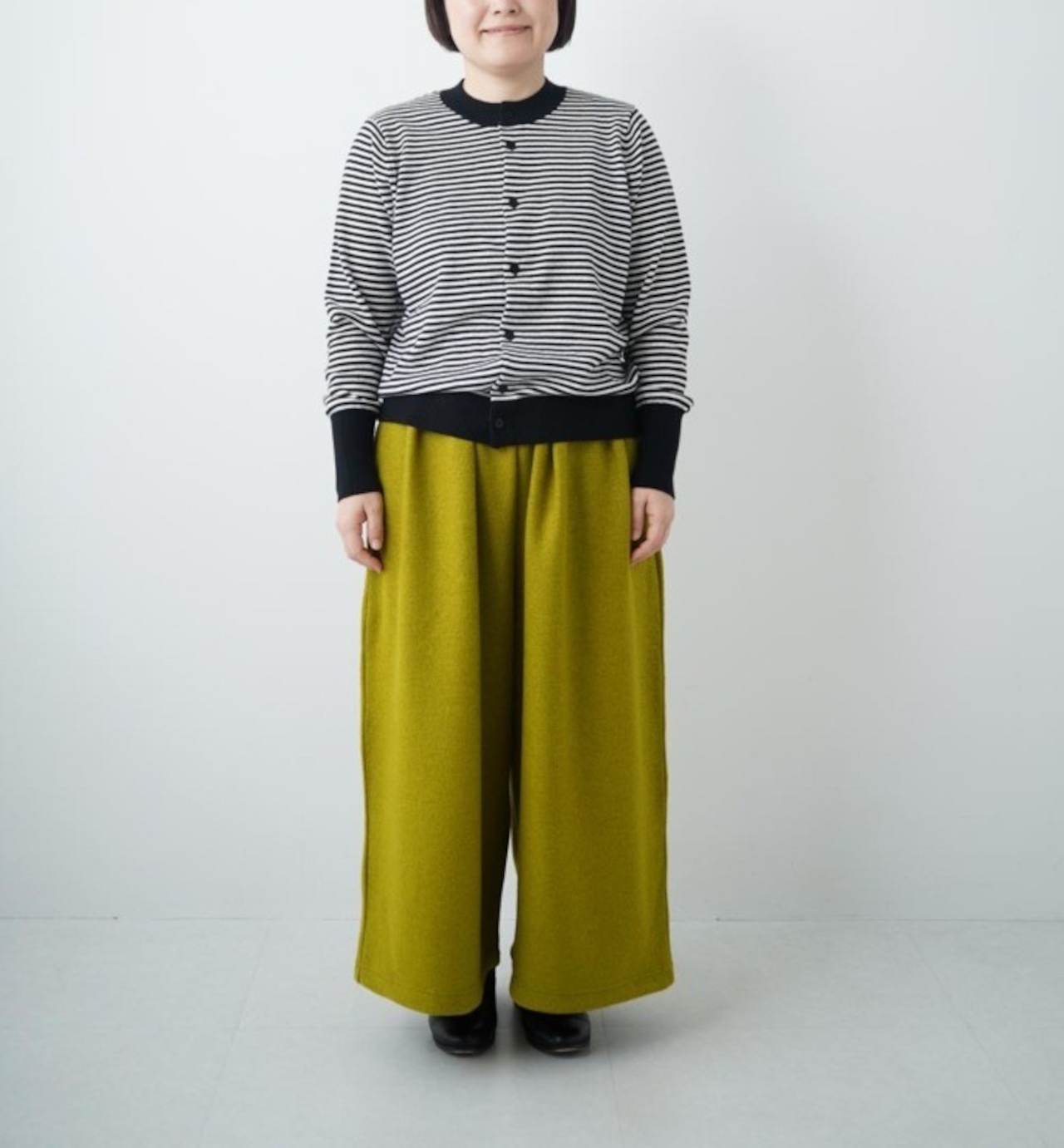 秋冬の定番、圧縮ブークレーより軽いですがフエルトのように目が詰まっているので風を通さず暖かい着心地です。ウールの混率が高いので明るい色も深みがあり上品。ふわふわとした凹凸感もあり秋冬らしい特徴のある素材です。程よいゆとりのガウチョパンツ。トップス2型と同素材なのでセットアップで着るのもオススメです。