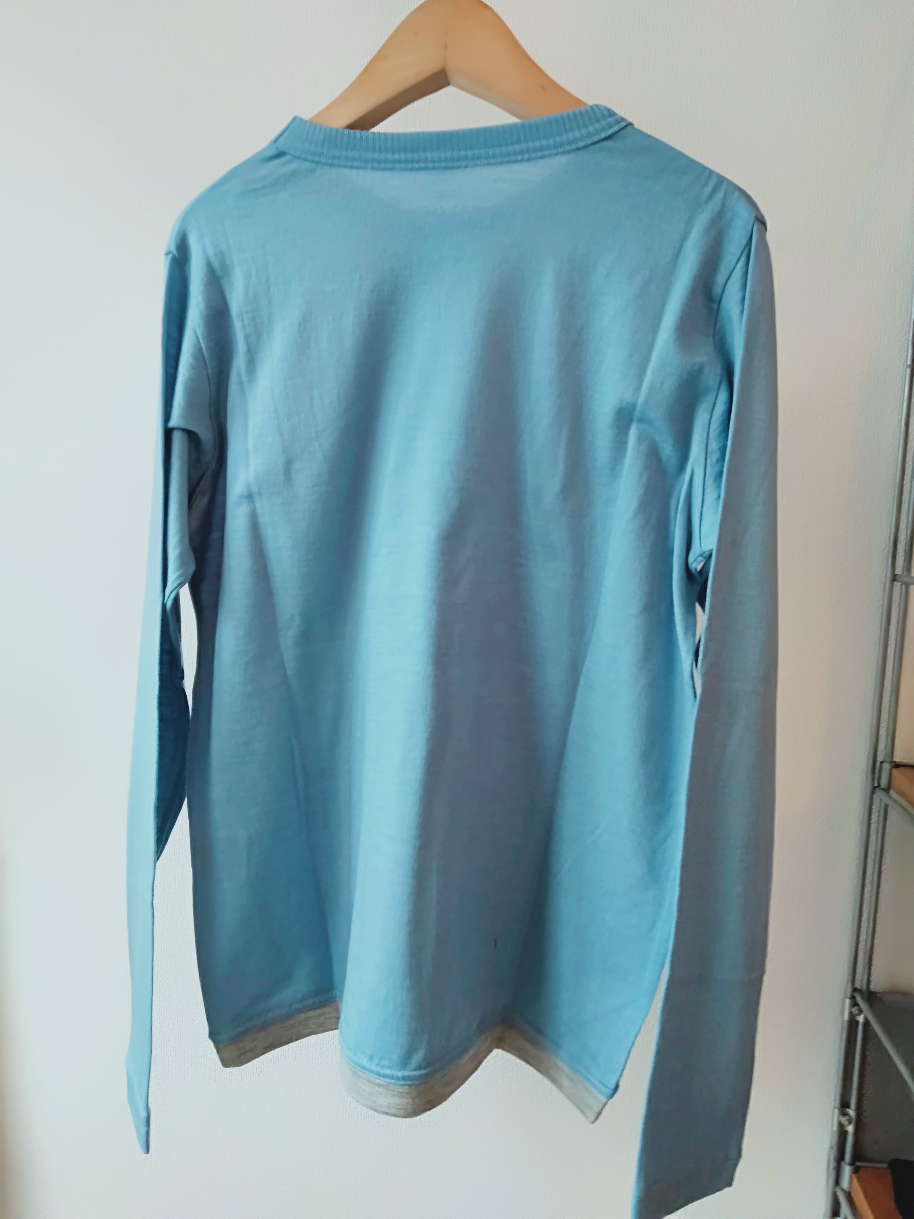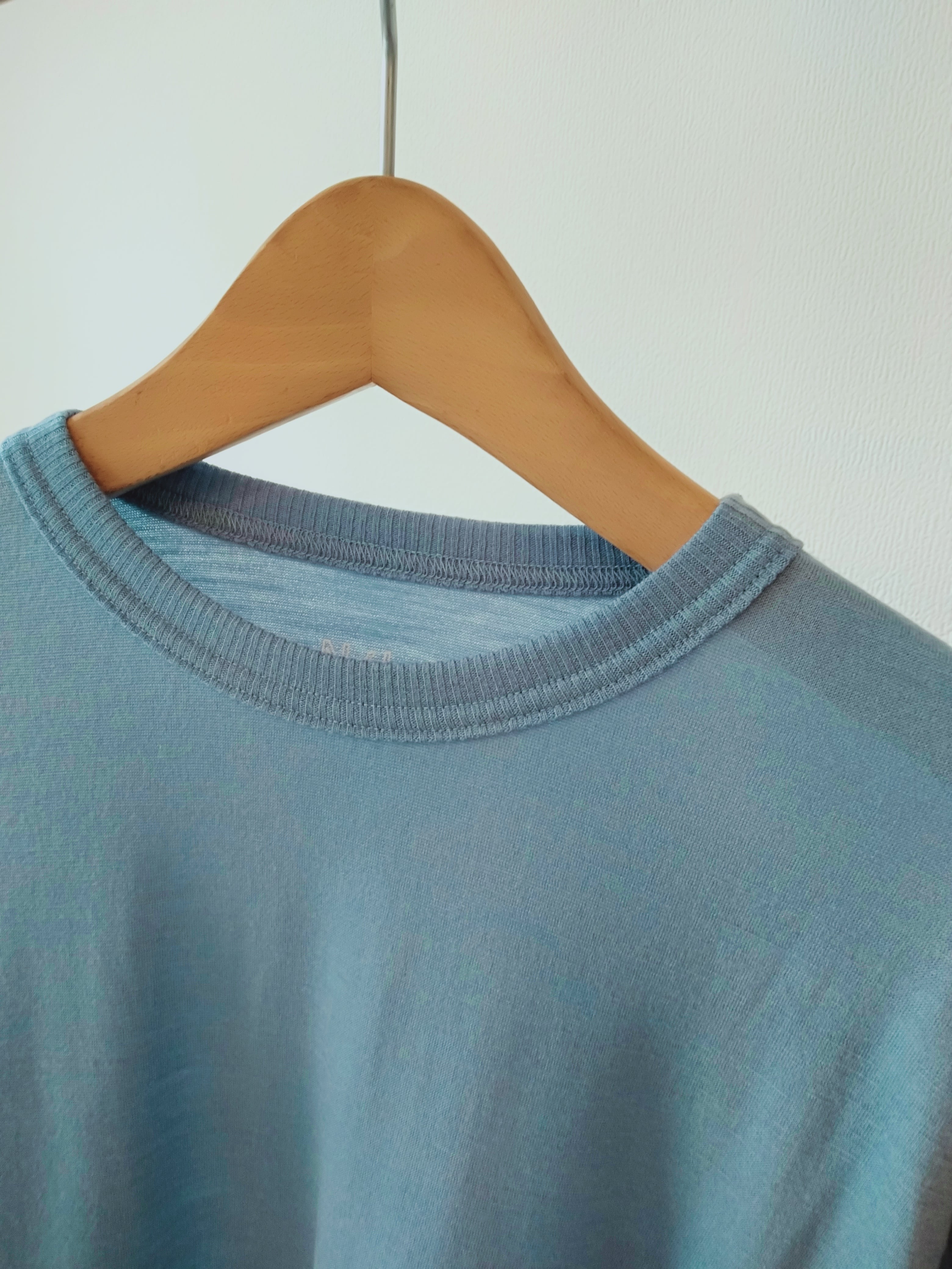 細番手のウール糸を使用したウール100%のカットソーです。薄手ながらも保温性があり天然繊維ならではの暖かさを維持してくれます着心地の良い肌触りで、抗菌防臭効果に優れています。しかもお家での手洗いが可能です。クルーネックのシンプルなPOですが、さりげなく裾の部分が配色になっているのがポイント。natural launndryらしいですね。
