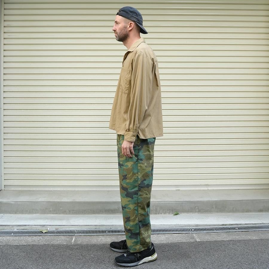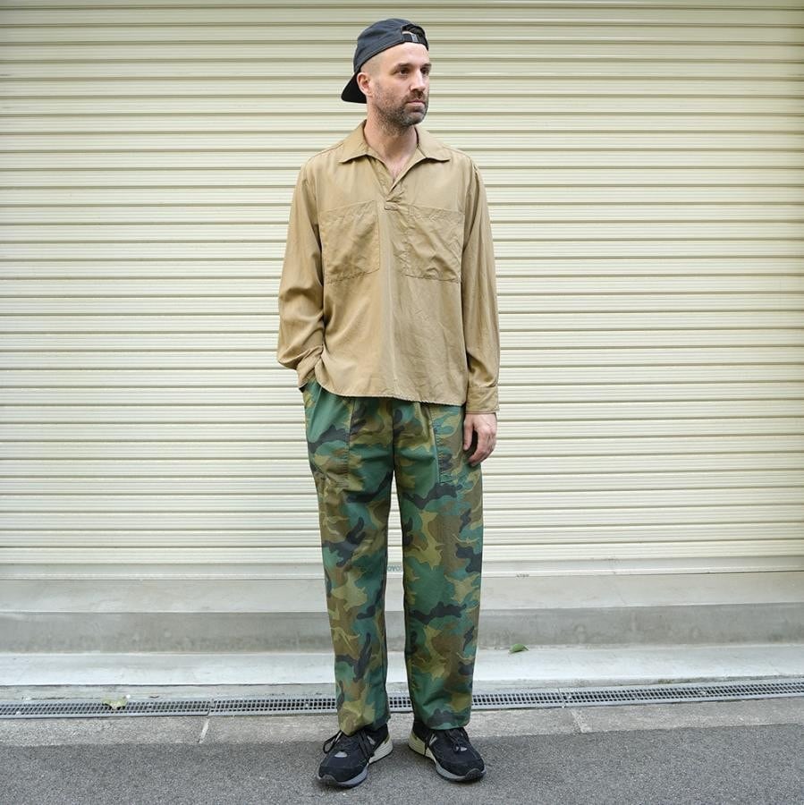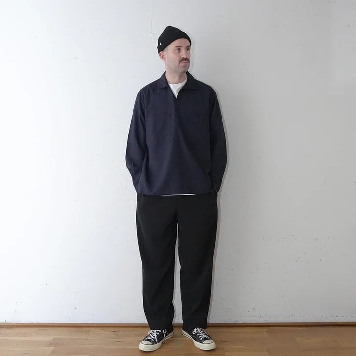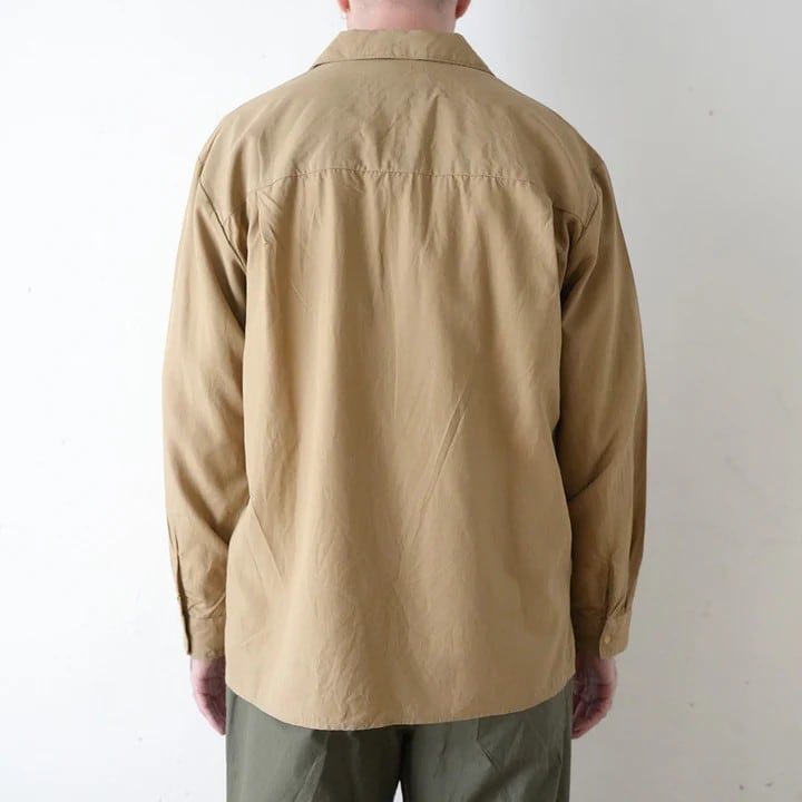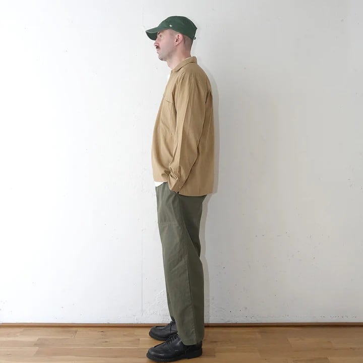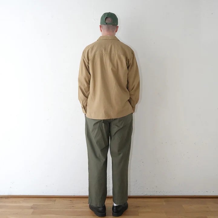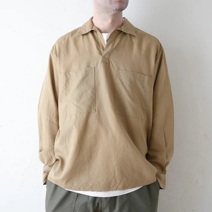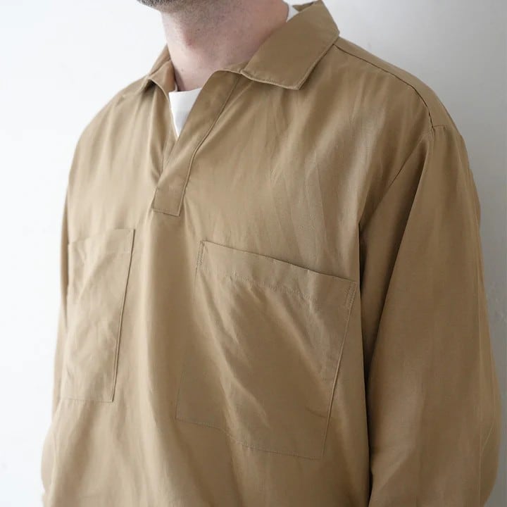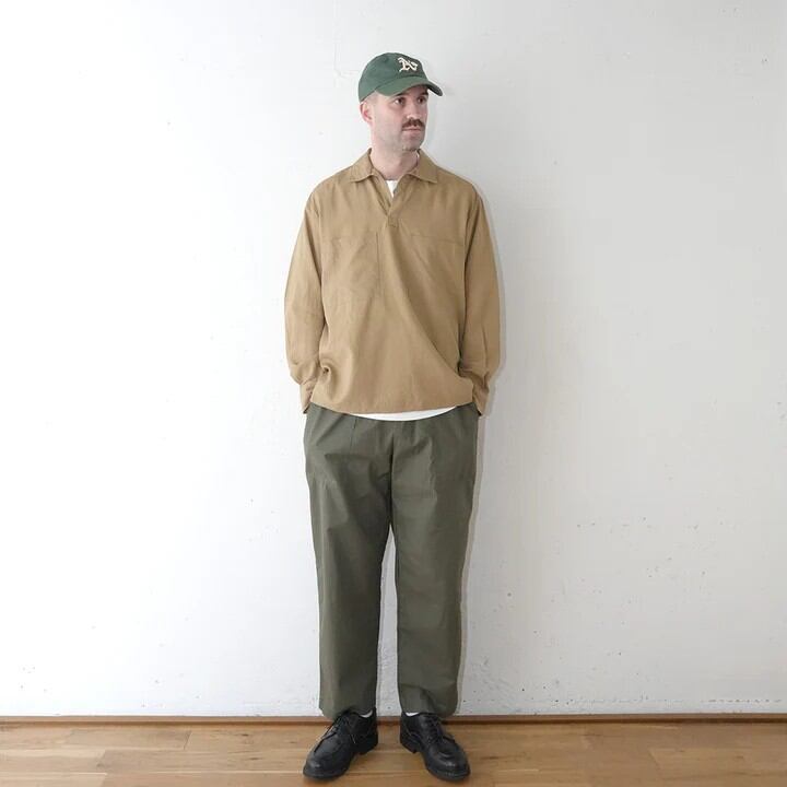 素材はテンセルのドレープ感とリネンの清涼感、そしてコットンのナチュラル感をブレンドさせたハイブリッドな天然繊維を使用しています。やや小ぶりな衿が特徴のスキッパータイプのプルオーバーシャツで、タップリと取った身幅に対しやや短めのすっきりとした丈が特徴です。細目・太目、またショートパンツまでバランスが取りやすく、T-シャツ感覚で羽織れるリラックスした一枚に仕上げました。