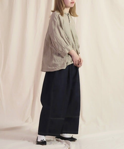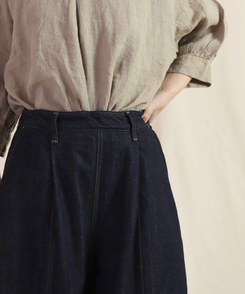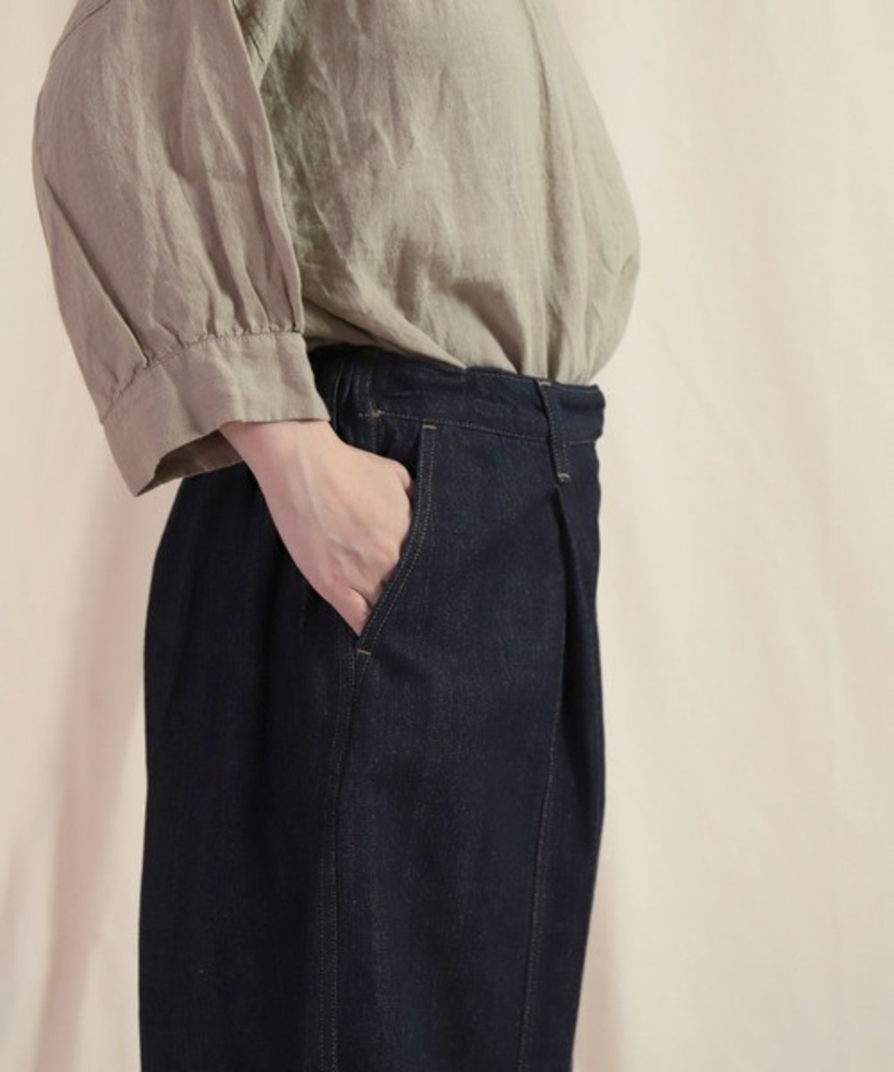 樽型のようなコクーンシルエットが特徴的なBrocanteを代表するトヌーパンツの素材を新たにリニューアルしました。裾のヒモを無くし、ラインをすっきりと見えるようにウエストにはヒモを入れてゴムとヒモで更に幅の広いサイズ対応ができる様になりました。ヴィンテージ感のある風合いの10ozムラデニムで穿くほどに味わい深い表情が楽しめます。樽のようなシルエットを引き出す為に前身頃を切り替えのパターンをとり、裾に向かって細くなるくるぶし丈です。ショート丈のブラウスやドロップショルダーのニットで、パンツのシルエットを活かしたカジュアル・モードスタイルをお楽しみ頂けます。