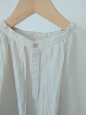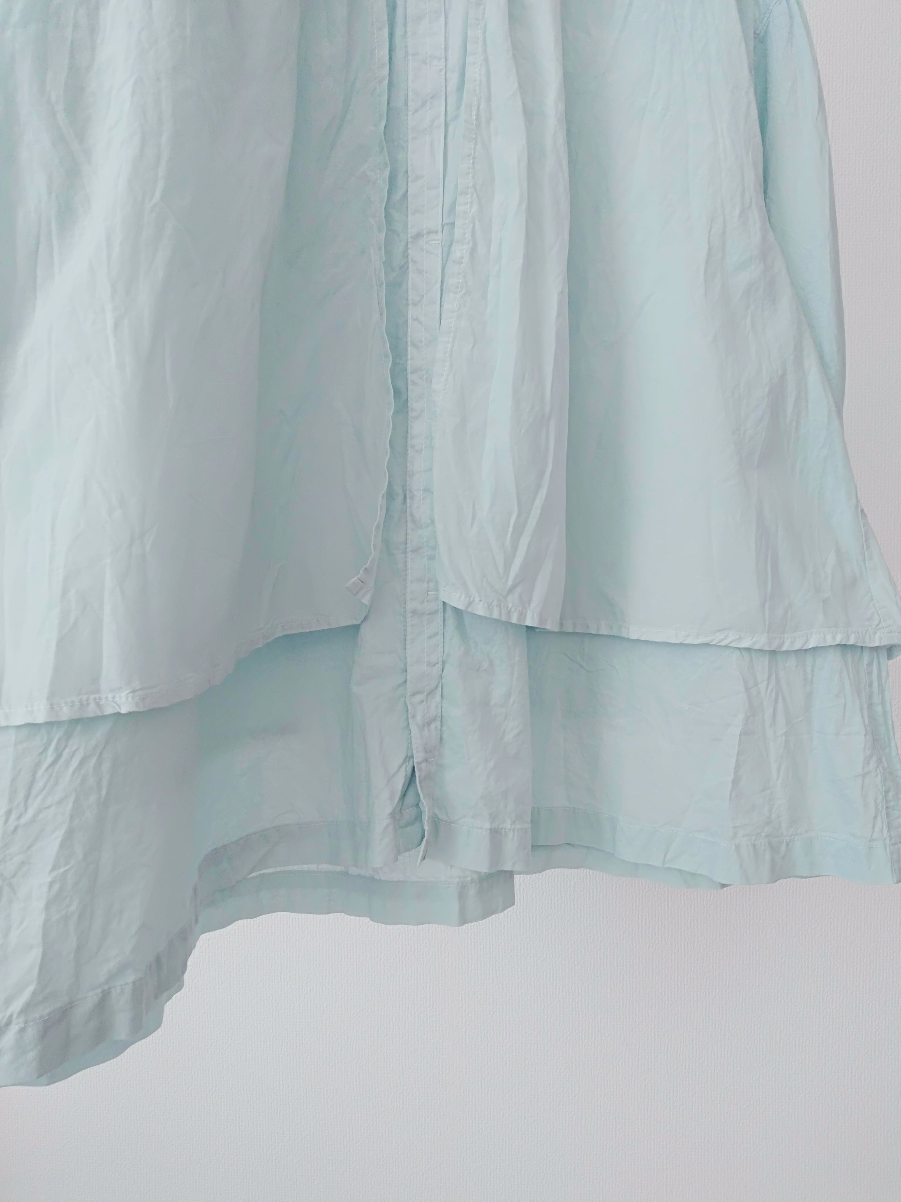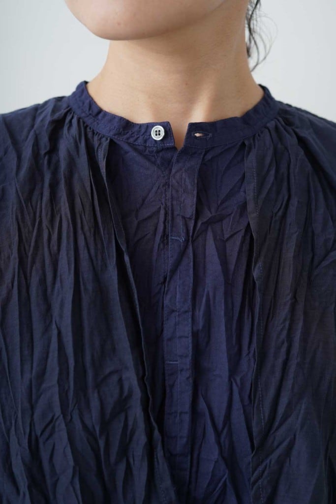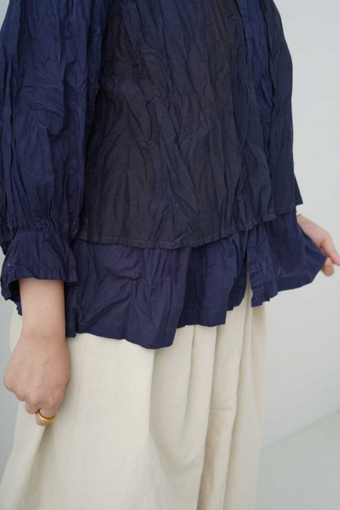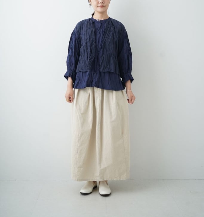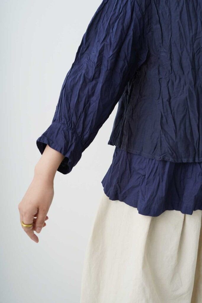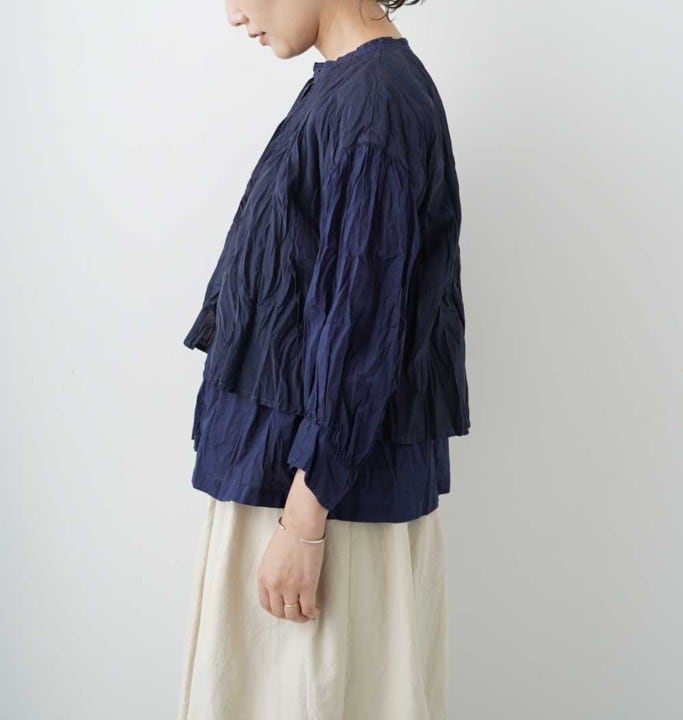 滑らかでしっとりとした肌触りが魅力の素材です。程よい光沢感と落ち付きのある色展開で上品に仕上げています。軽やかで通気性が良く春に心地よく着て頂けます。製品染めを施すことで生まれたgrinらしい優しい表情を楽しめます。スタンドカラーのシャツの上にベストを重ねたようなデザインのレイヤーシャツ。全体にリンクル(シワ)加工をして仕上げています。