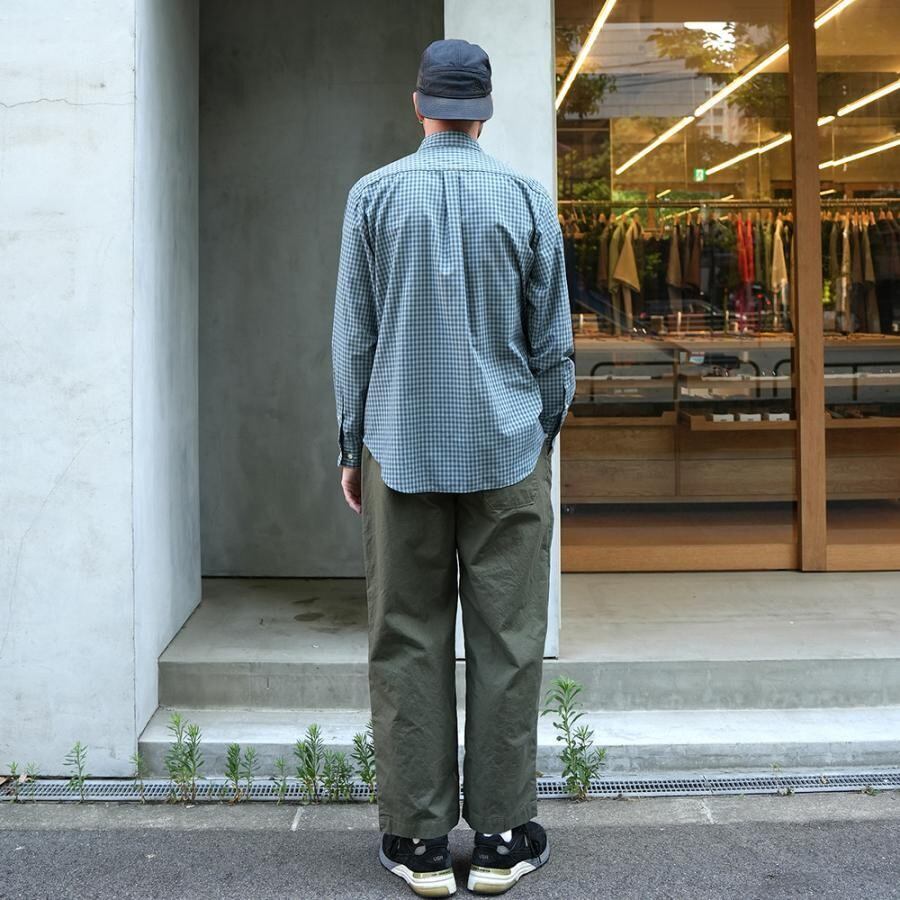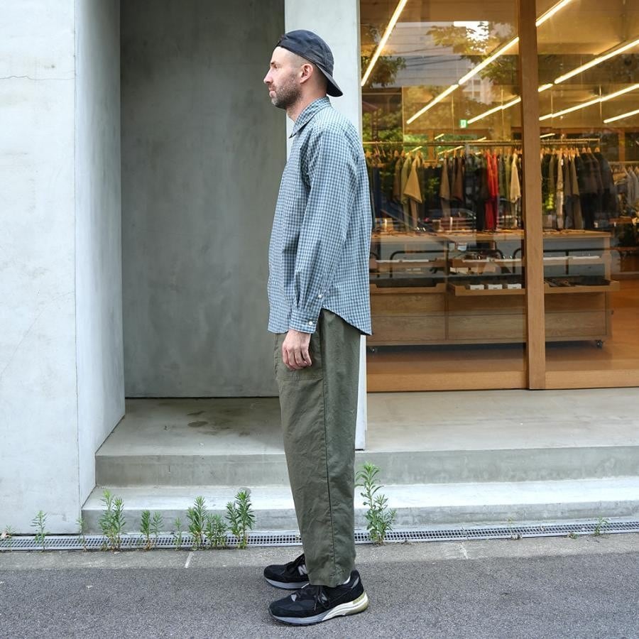 定番のワイドイージーパンツをベイカーパンツ風にアレンジし、丸みのあるユニセックスなシルエットに程よくミリタリー要素をプラスしました。ウエストにはスピンドルとベルトループを備えており、ベルトでしっかりと穿きたい方にも対応可能です。