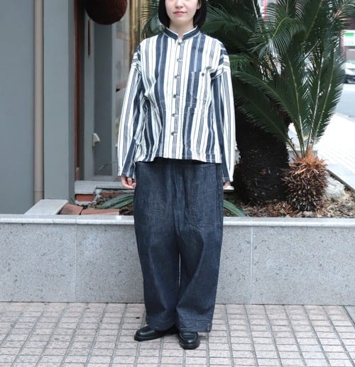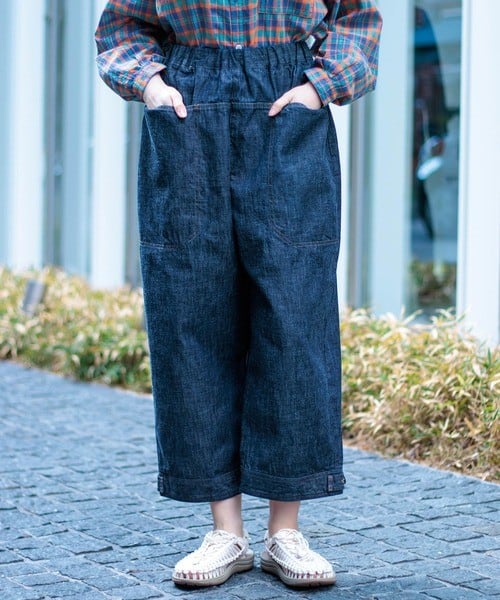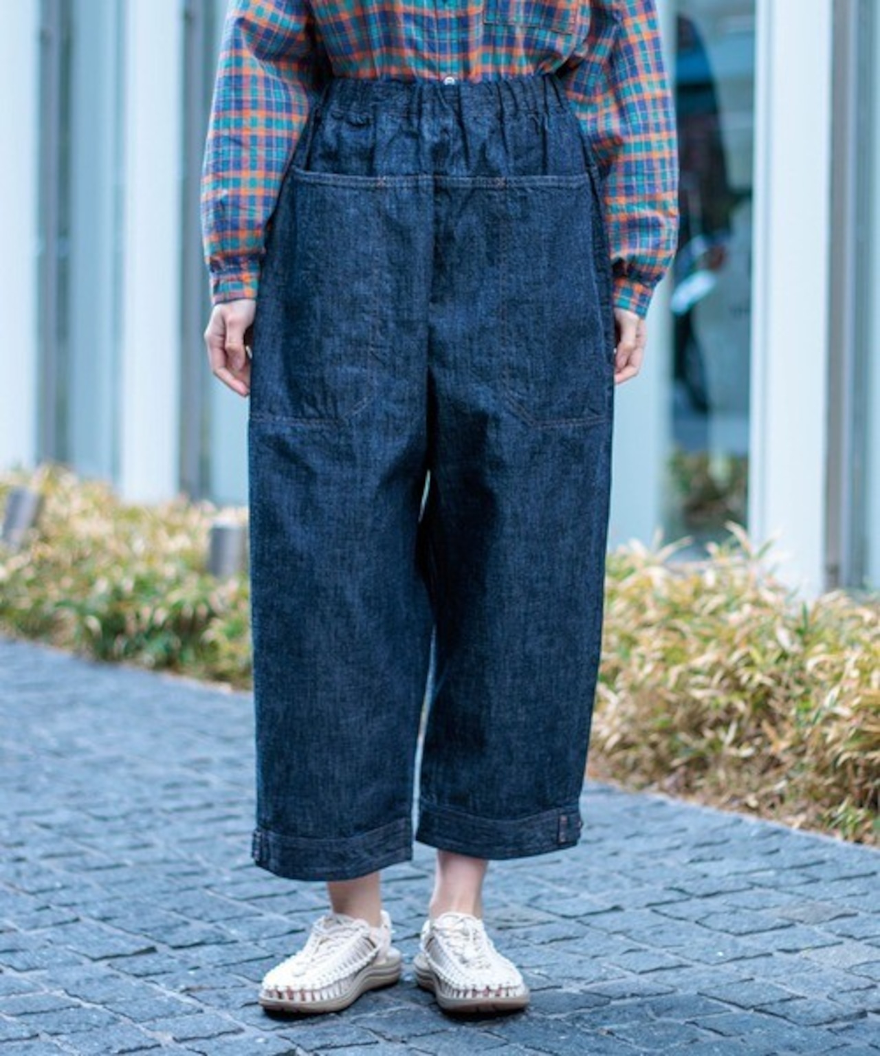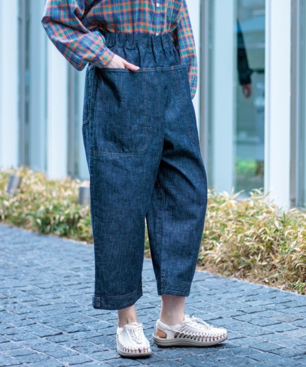 縦横のムラが特徴的なジンバブエデニムを使用。ソフト加工を施しているので柔らかい質感が特徴です。ウエストにゴムと内側にドローコード(紐)を施した、ベルトレスで着用できるイージーパンツ。ウエストは総ゴム仕様に加え、内側にはドローコードを施したベルトレスで着用可能。安定感のある快適なフィット感を実現しています。股上を深く取り、ヒップから腿周りにかけて分量感を持たせたオーバーサイズシルエットは、裾に向かって緩やかにテーパードを効かせ、丸みのある美しいフォルムを描きます。前後に施した大きめポケットがデザインアクセントに。裾にはアジャスターを施しているので、裾のシルエットをワイドストレートから裾絞りまで2段階調整でき、気分にあわせて着こなしのアレンジが可能に。