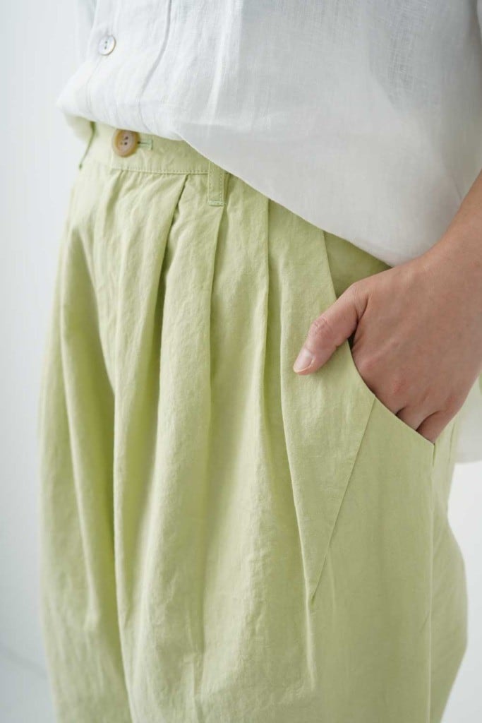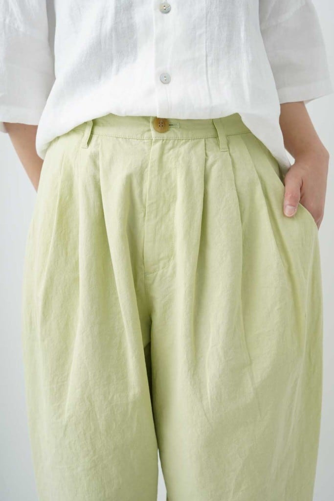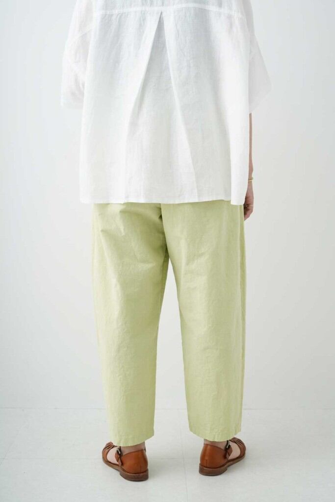 綿麻特有のシボシボとした表情がナチュラルな素材感を際立たせ、柔らかな色合いが大人らしい上品さを引き出します。セットアップの着用もオススメです。軽やかなCLシーチング素材を使用した『grin(レディース)CLシーチング シャトルパンツ』は、春夏にぴったりの一着です!柔らかな素材感と快適な着心地が魅力で、日常使いからお出かけまで幅広く活躍します。シンプルながらも洗練されたデザインは、どんなスタイルにも簡単に合わせることができ、コーディネートの幅を広げてくれること間違いなしです。股上を深く取り、ゆったりとしたシルエットに仕上げています。裾に向かって優しいラインを描くテーパードデザインが、軽やかさを添えてくれます。ウエストは楽なゴム仕様で、内側には調整可能なドローコードを施しているため、フィット感も自由自在。快適さを追求したこのパンツは、リラックスした時間を提供します。