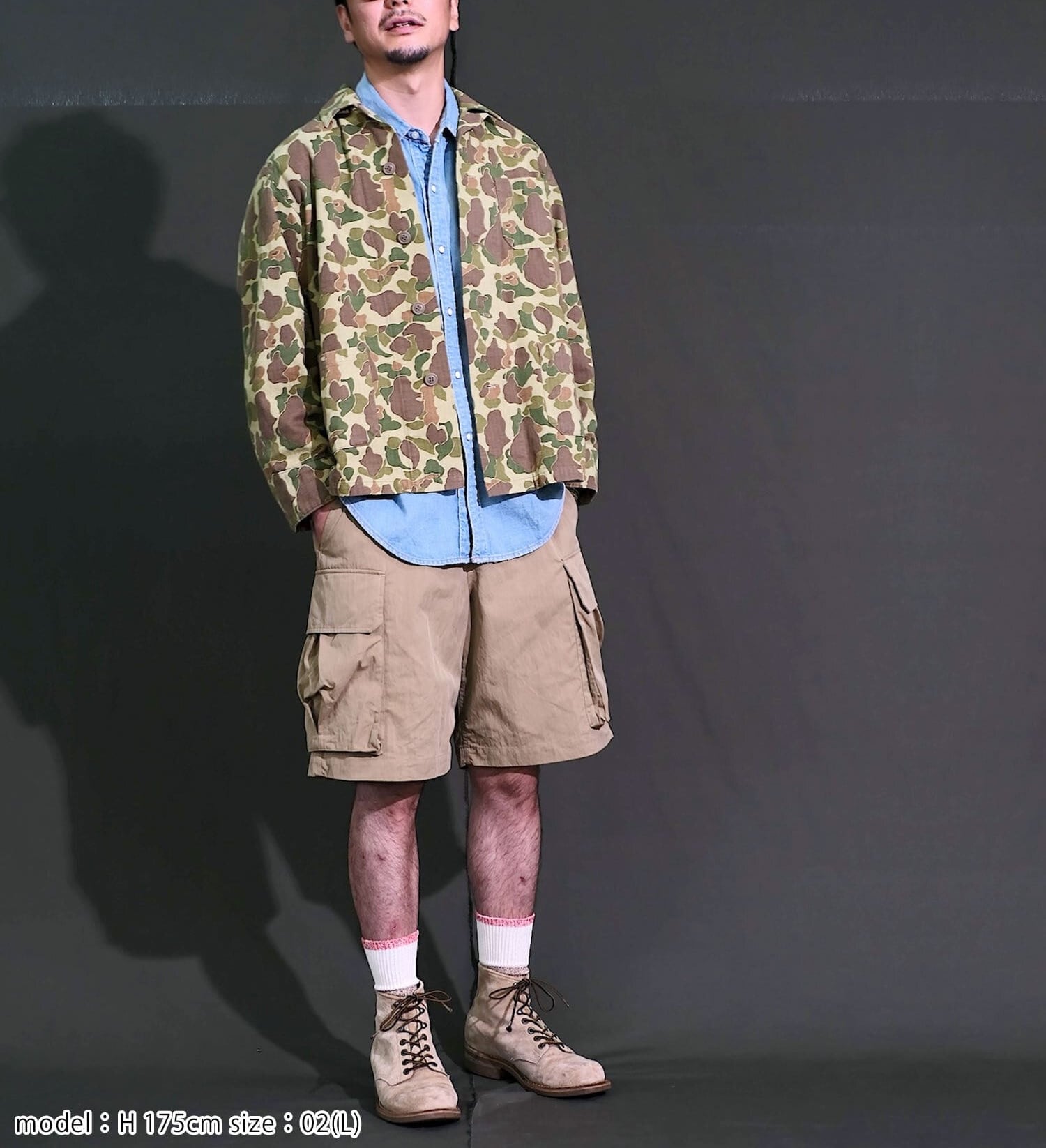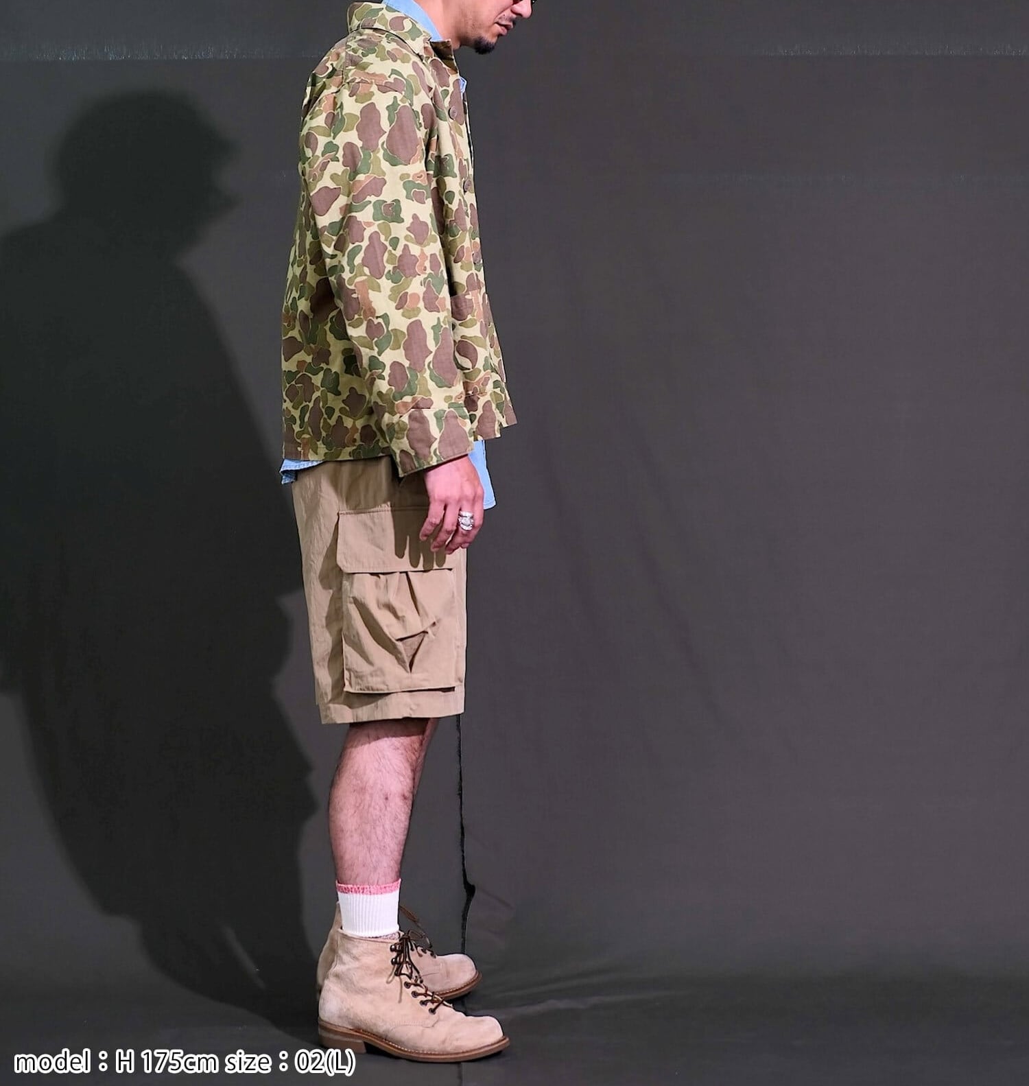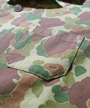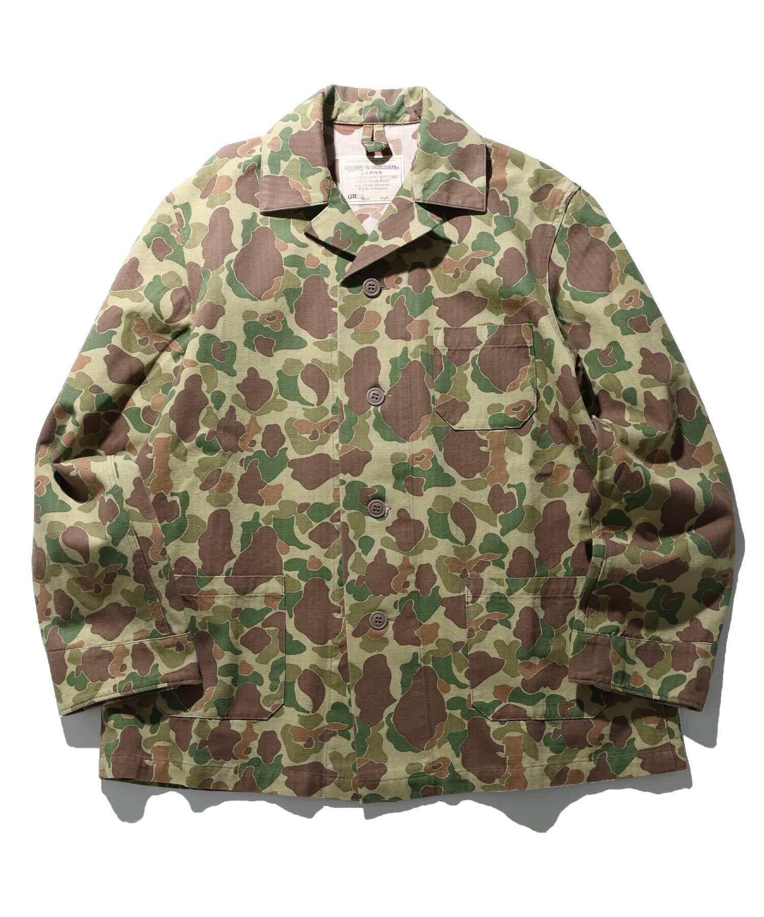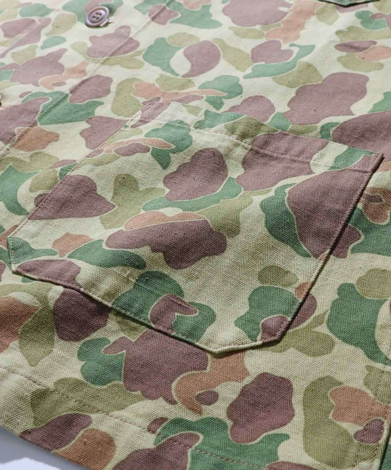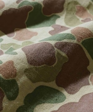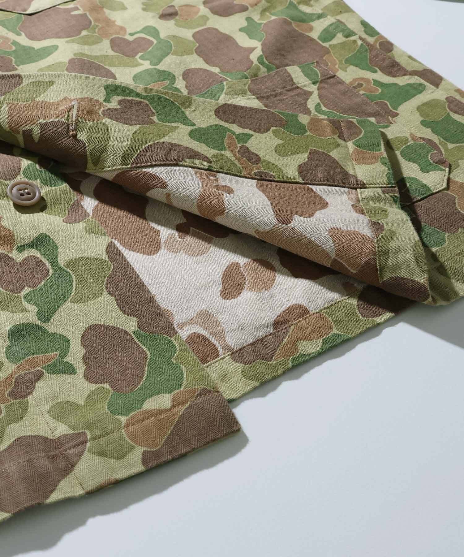 1940sアメリカ軍がドイツ遠征の際に使⽤し、カモフラージュのパターンが敵国のものと酷似していた為、誤射が相次ぎ、使⽤中⽌に到った経緯を持つ魅⼒的なカモ柄を採⽤し、デザインには戦地で誤射されること無く茂みで寝られるようにと、スリーピングジャケットデザインで落とし込み。ふざけた思案を現代のファッションスタイルに取り入れた、春、秋冬と幅広いシーズンをカバーできる1着に仕上がりました。