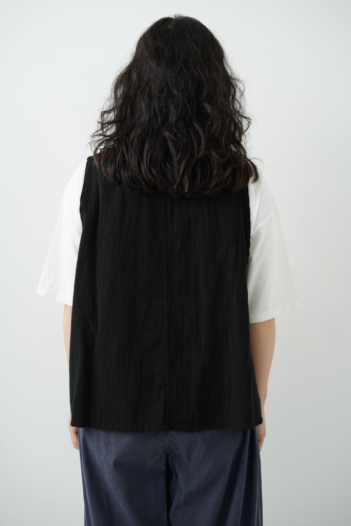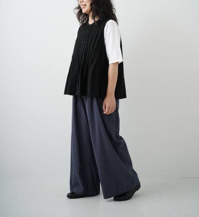 コモドとはフランス語で『気楽』『便利』といった意味になります。コモドクロスは生地を小さな窯でよーく揉みこんで洗いにかけているので柔らかく、肌馴染みの良さがあります。加工の工程で細かいシワ等入りますが素材の特徴として捉えていただきたいです。