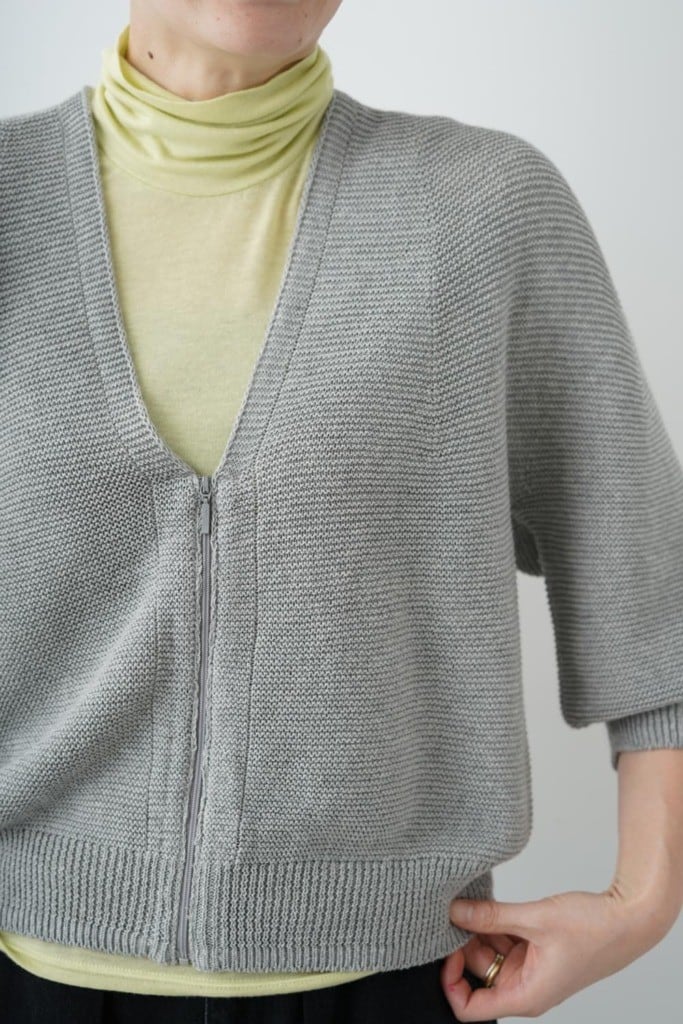 擬麻(ギマ)加工という麻のようにシャリシャリ涼しく感じる加工をした糸と肌触りの良いコットン糸をかけ合わせて作っています。編み目が引き立つ個性的な糸は国産ならでは。ざっくりとした見た目ですが驚くほど軽くホールガーメントで作られているので、袖下や脇に縫い目がなく着心地抜群。洗いをかけているので、お家で手洗いして長く着て頂けます。コバルトブルーが新鮮です。フロントジップアップ、ショート丈、ドルマンスリーブのデザインが、軽やかさをプラスしながらも、ちょっとしたアウターとして重宝します。ベーシックな色合いが大人らしい上品さを引き立て、デイリー使いや特別な日のお出かけまで、多彩なシーンでご利用いただけます。