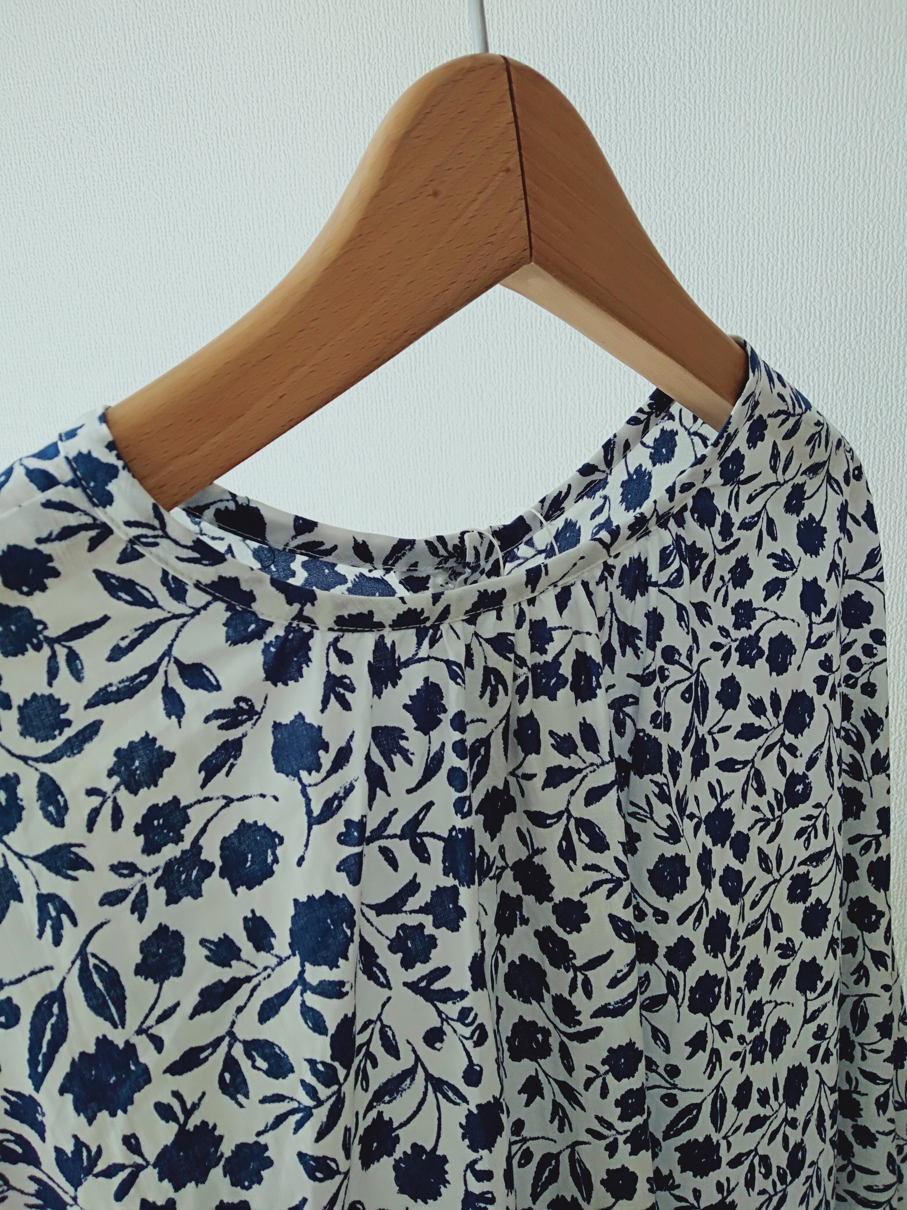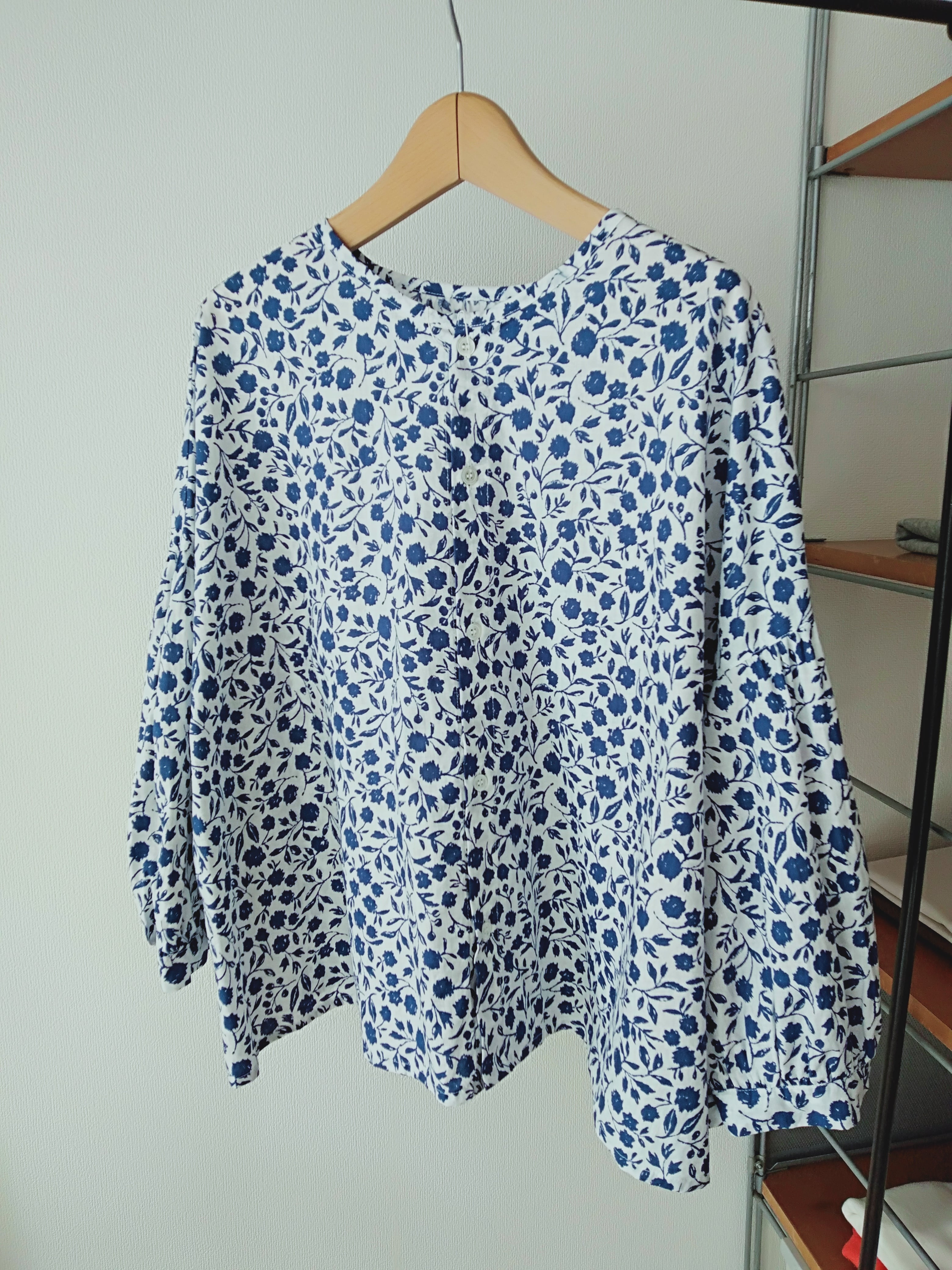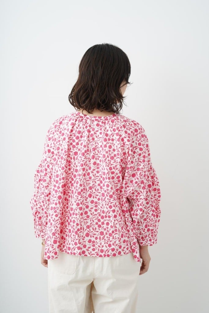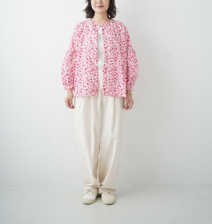 N/Lオリジナルのフラワープリント。ヨーロッパに昔からある花柄のお皿をイメージしています。手書きのがさっとしたタッチと小花よりも少し大きめな花柄が他にはないN/Lらしいプリントになっています。ノーカラー、パフスリーブのカーディガンシャツ。後ろボタンにして着ることもできる2way仕様です。ボトムスには、スカートやパンツ、ガウチョなど、様々なアイテムとの相性も良く、デイリーから特別な日まで幅広く活躍します。