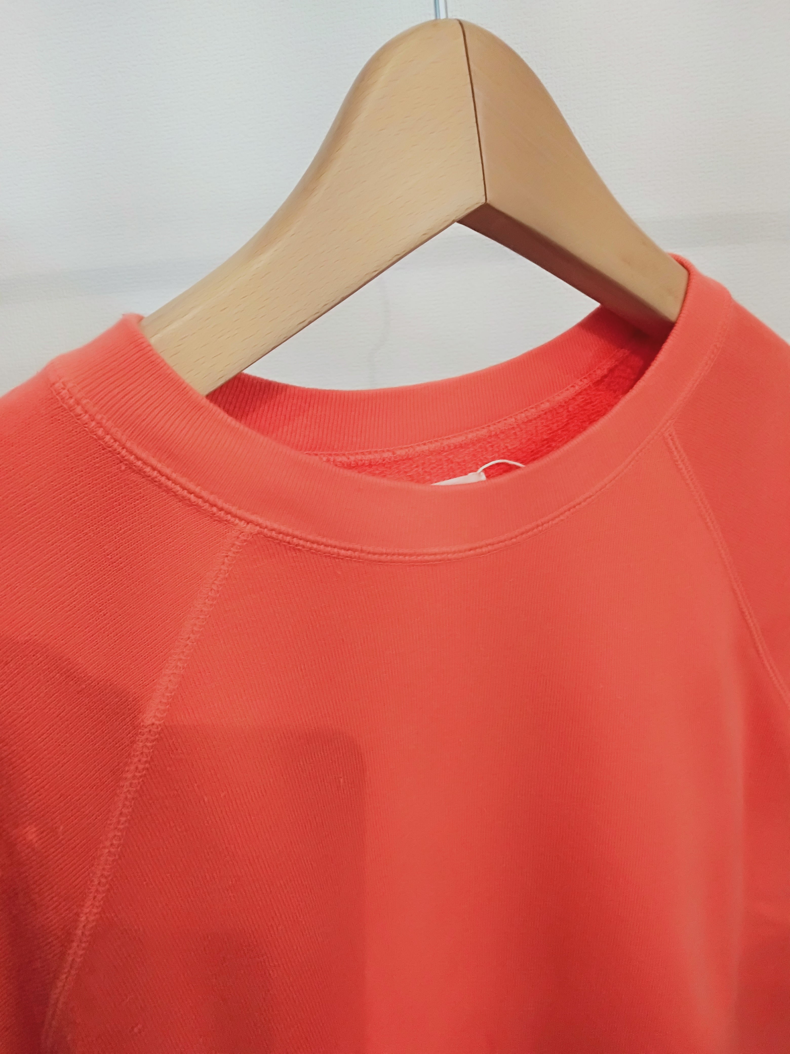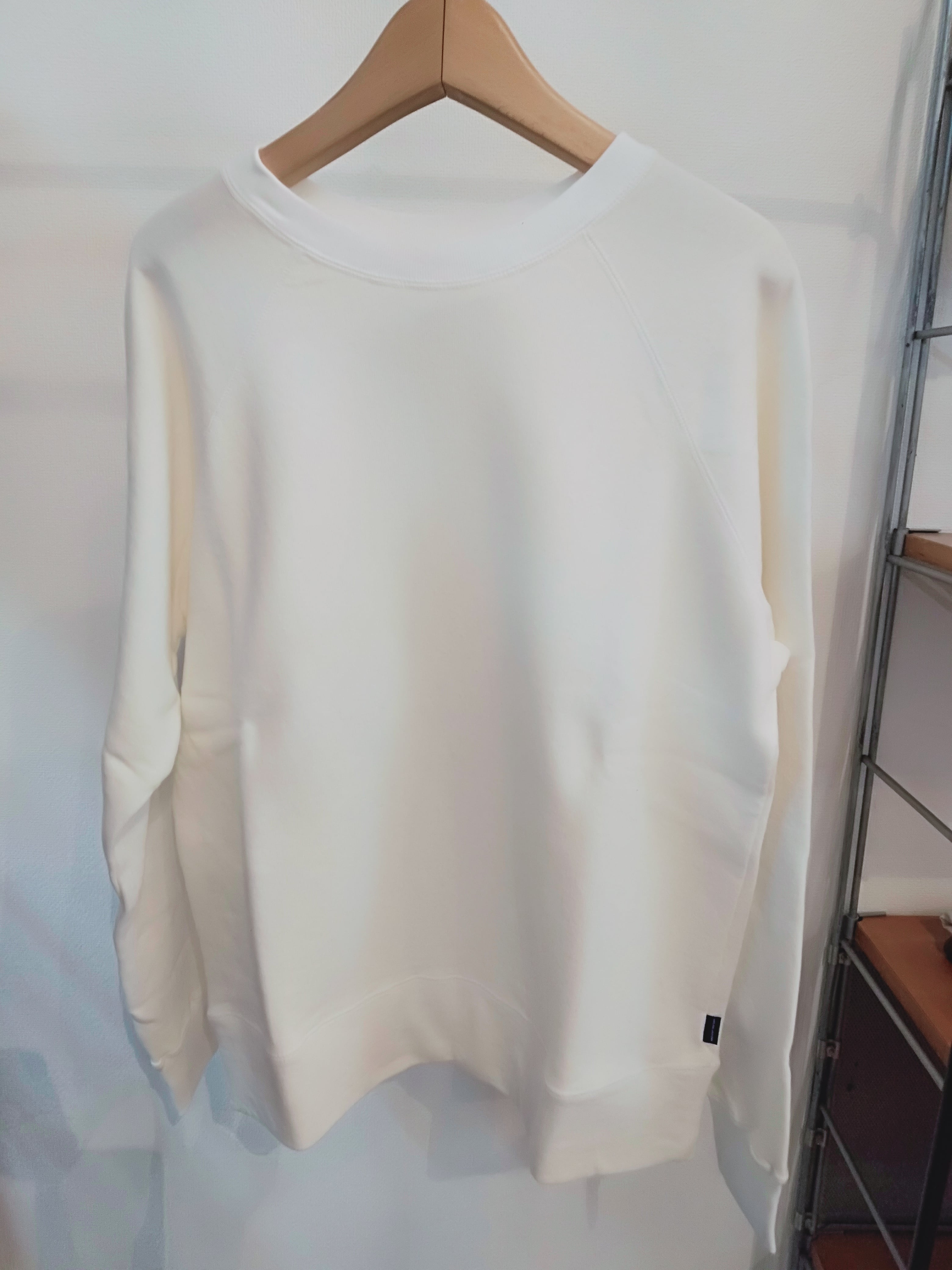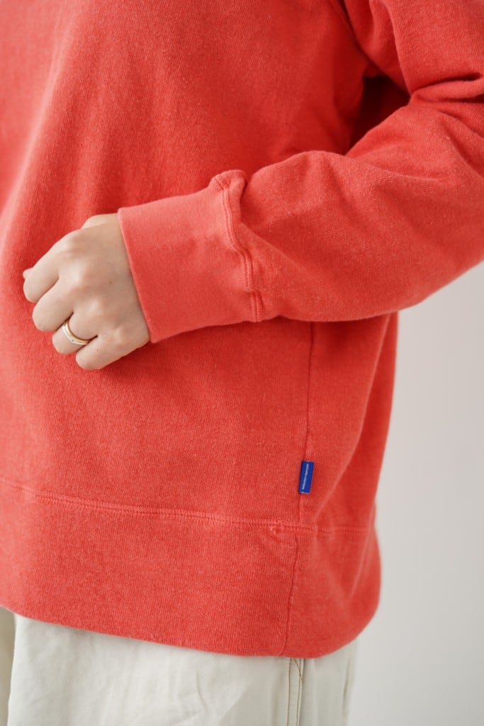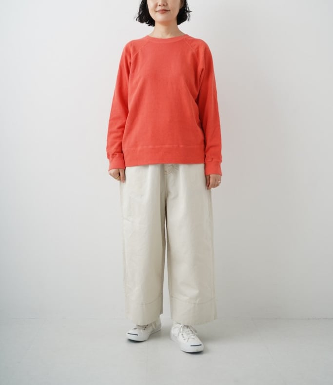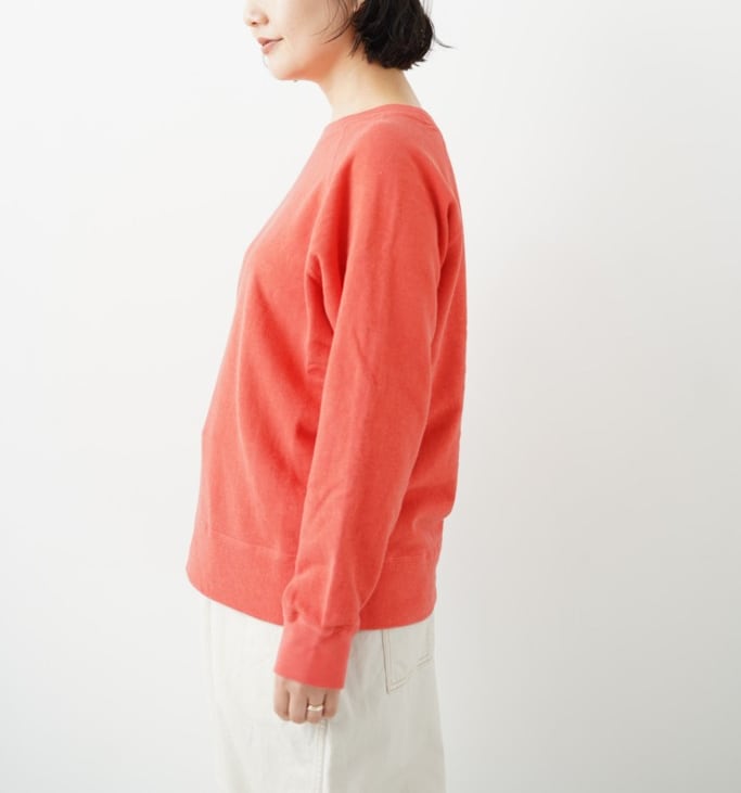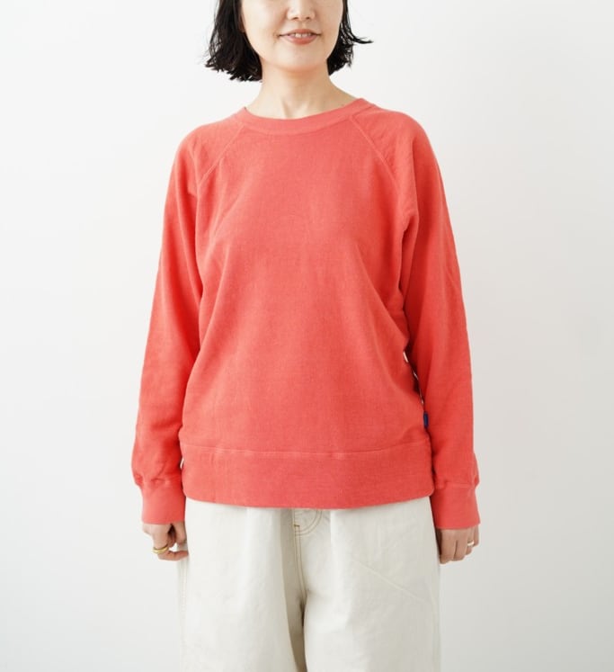 表糸に綿麻の糸を使用した裏毛です。麻特有のシャリっとした表面感が特徴。綿麻素材を製品染めすることによってヴィンテージスウェットのような独特の風合いが出ています。軽やかで程よい柔らかさがあるので着心地も良いです。クルーネック、ラグランスリーブのシンプルなPOスウェット。気持ちいい素材と大きすぎないサイズがgoodな一枚。