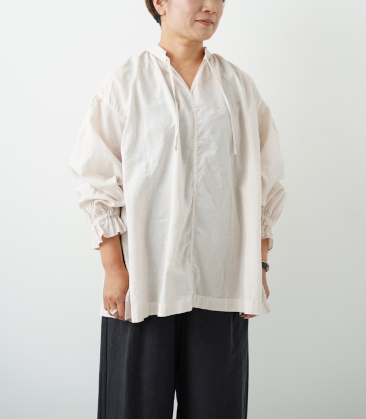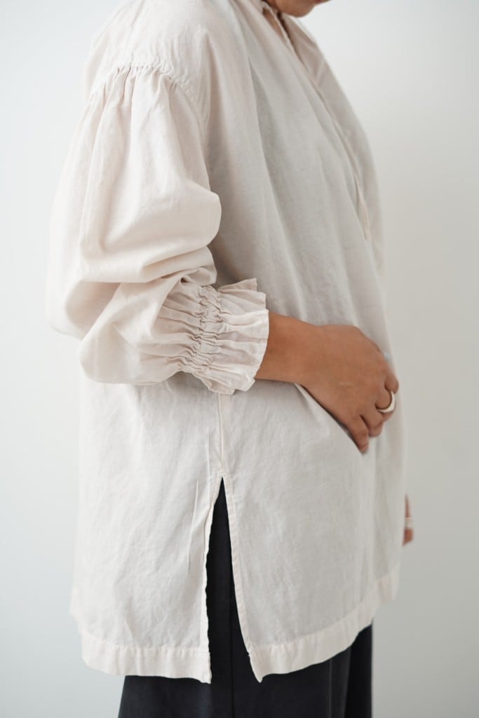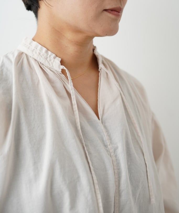 薄手のガーゼボイル生地。柔らかく軽いので涼しい着心地。着ていくほどに肌馴染みの風合いが出ます。製品染めでgrinらしい色目が目を引きます。ノーカラー、ゆったりした身幅と袖、長すぎない着丈のPOスモックシャツ。このシャツは、肌に優しい綿100%素材で作られており、自然なストレッチ性があるため、日常のさまざまな動きにも対応。カジュアルスタイルからちょっとしたお出かけまで、幅広いシーンで活躍するデザインです。シルエットは非常に軽やかで、リラックスした着こなしが楽しめます。シンプルなデザインですので、ボトムスやアクセサリー次第でさまざまな表情を楽しむことができます。デイリーコーディネートに華やかさをプラスし、あなたの個性を引き立てます。ショッピングやランチ、カジュアルなデートシーンにもぴったりです。