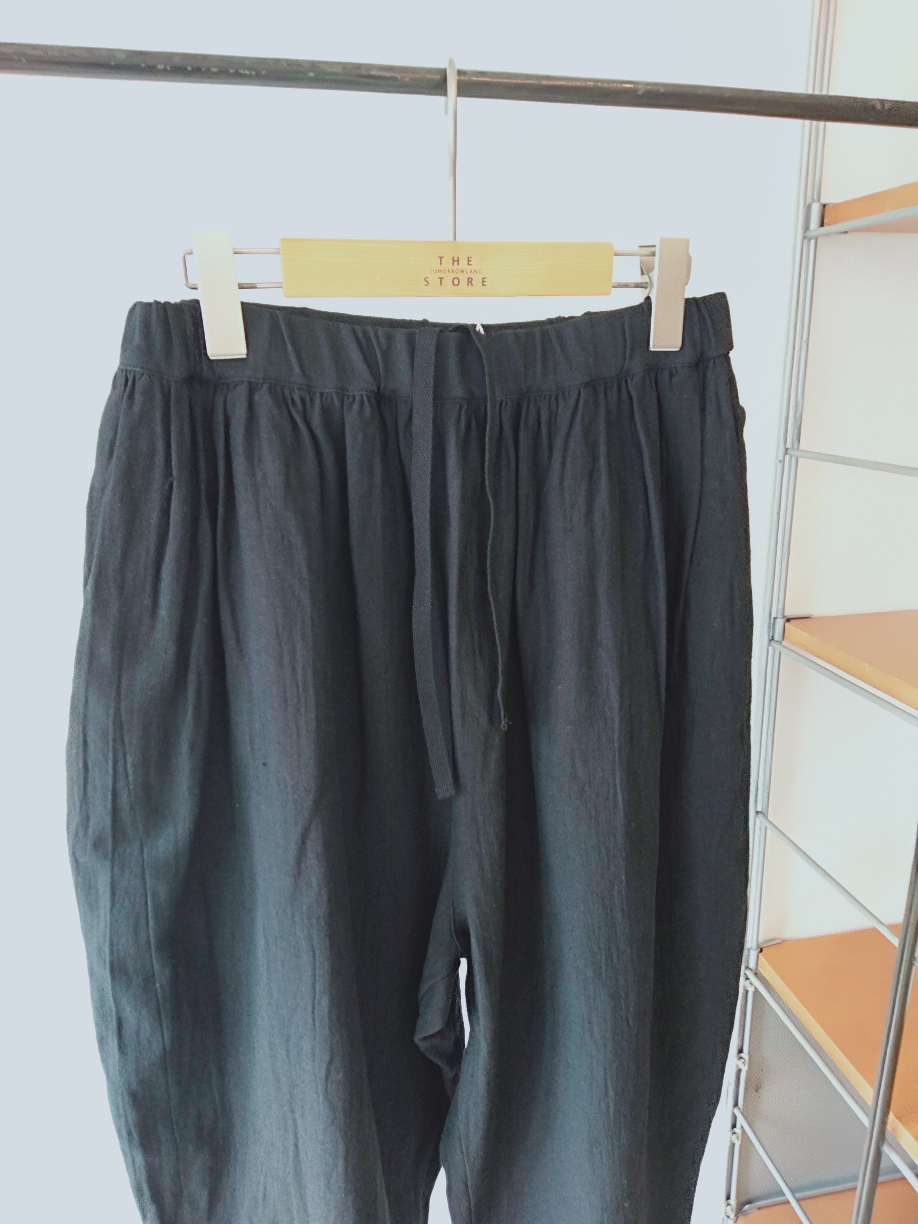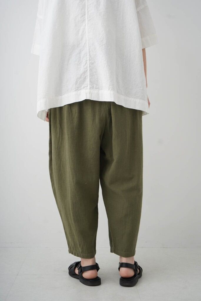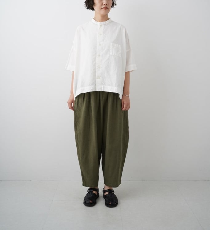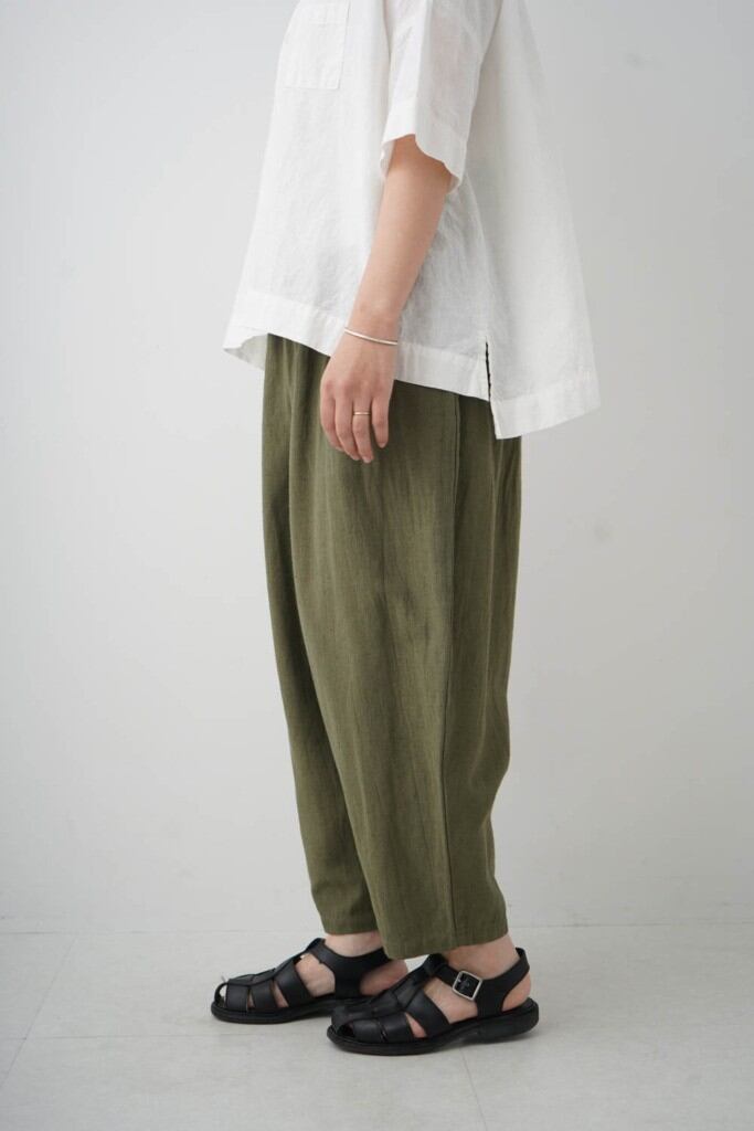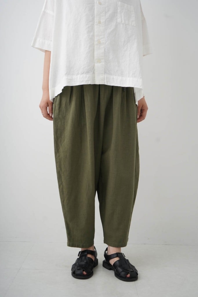 麻混率が少しアップして清涼感が増しました。肌に当たる側は綿になっているので優しいタッチです。ウエストはゴム紐仕上げ、腰回りにゆとりがあり、裾に向かってテーパードしたデザイン。そのシルエットから“マヨネーズパンツ“と名付けられたgrin人気のパンツです。是非同素材のJACとセットアップで着ることをオススメします。