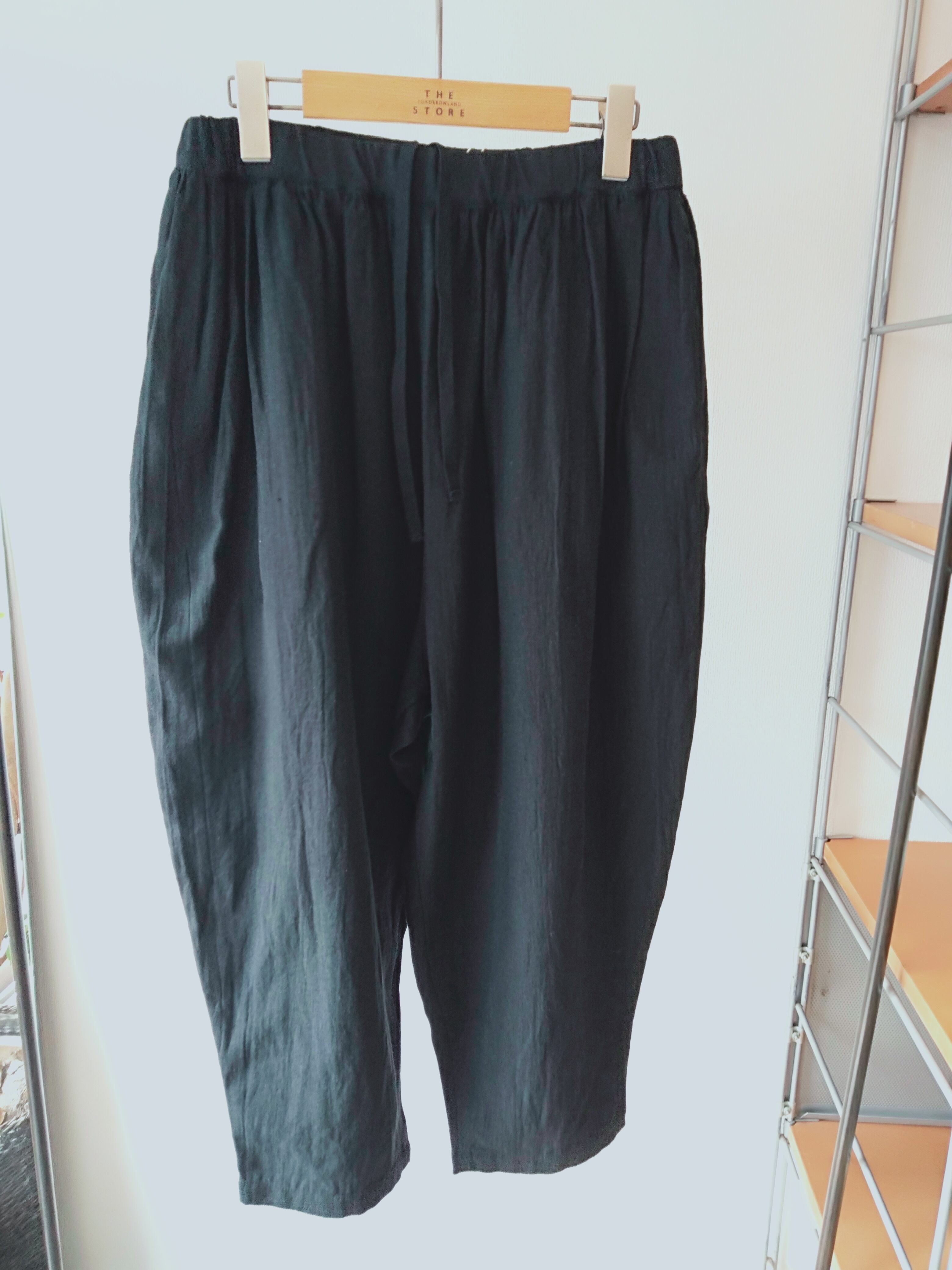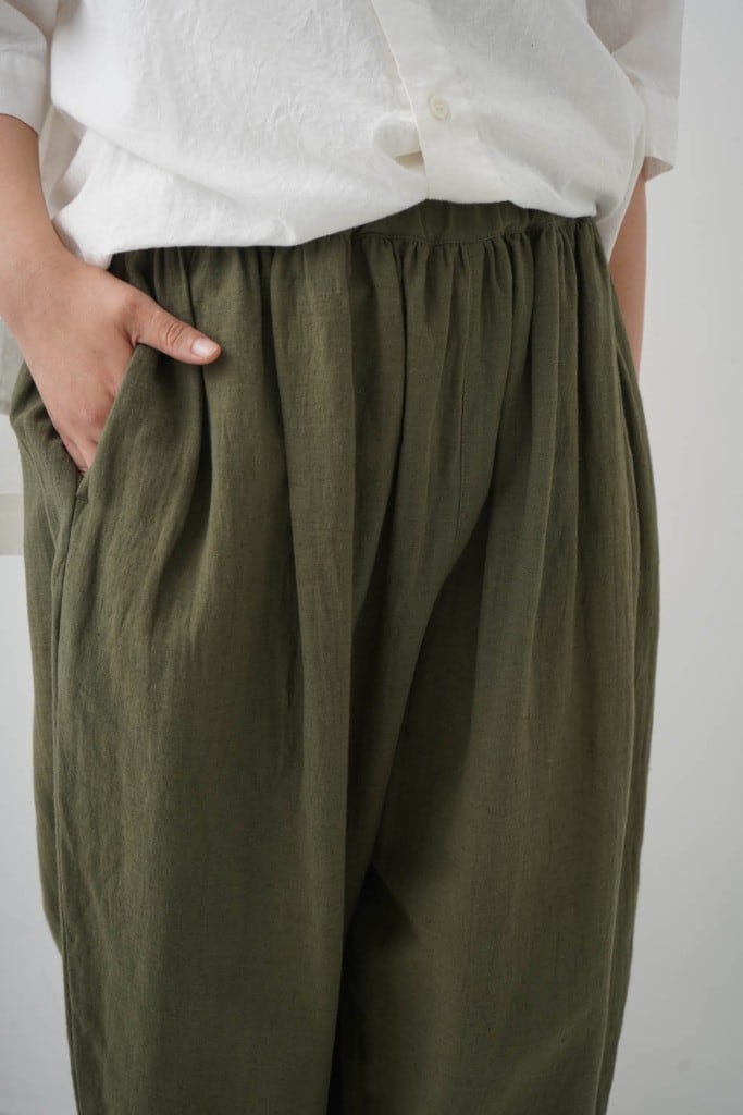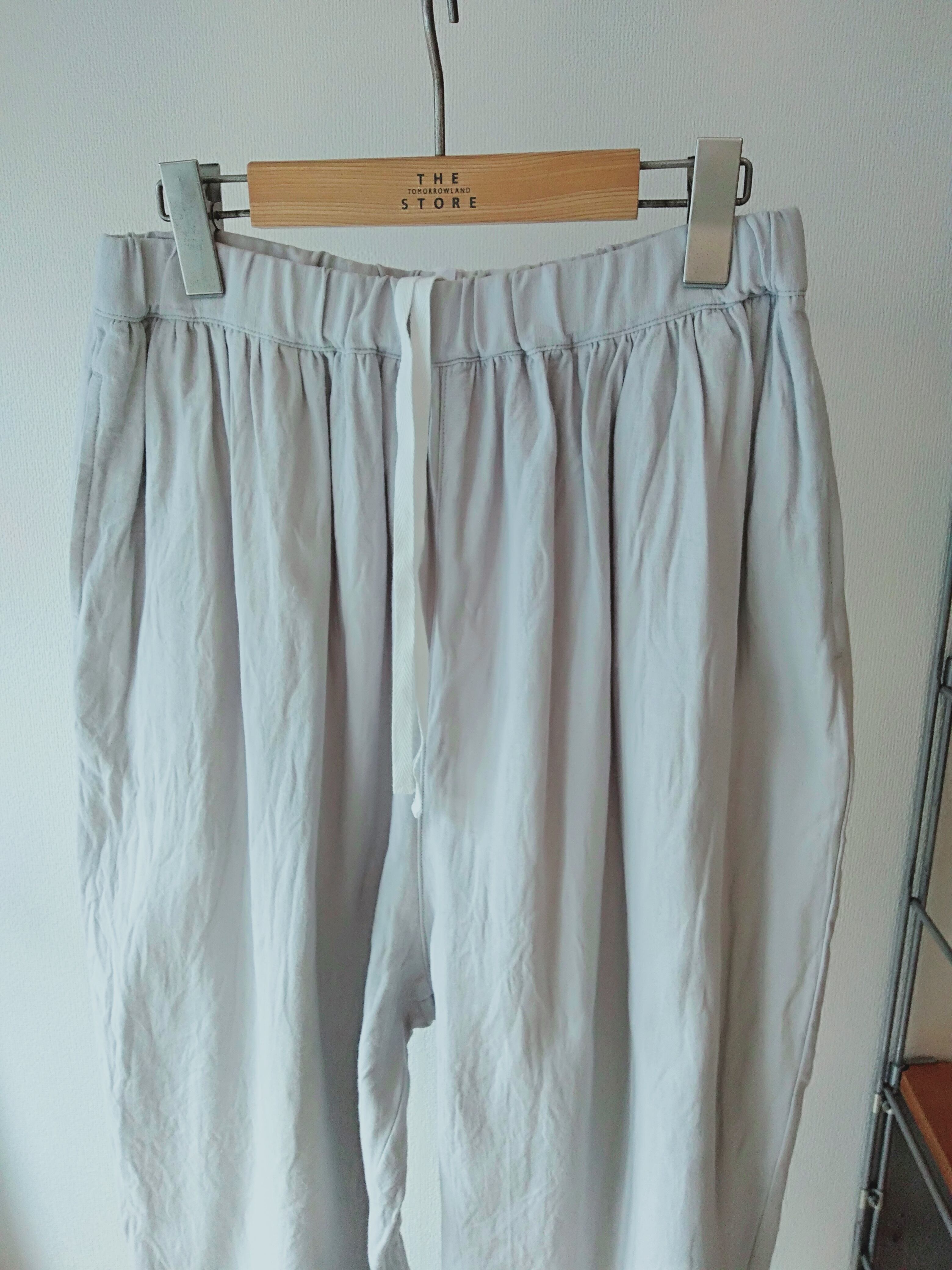麻混率が少しアップして清涼感が増しました。肌に当たる側は綿になっているので優しいタッチです。ウエストはゴム紐仕上げ、腰回りにゆとりがあり、裾に向かってテーパードしたデザイン。そのシルエットから“マヨネーズパンツ“と名付けられたgrin人気のパンツです。是非同素材のJACとセットアップで着ることをオススメします。