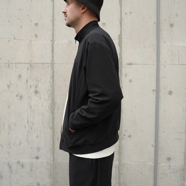 発熱する特殊な機能ジャージー素材LEOTHERMO®を使用した裏起毛ジャージー素材のトラックジャケット。機能糸を用いた生地設計により伸張することで発熱する機能素材"LEOTHERMO®"ジャージーを使用。ミリタリージャケットをベースにした切り替えのデザインがシンプルながらアクセントになるアイテムです。コーディネートを問わずどんな場所や場面にも履いていける万能アイテムで、セットアップで着用可能なパンツも用意しています。