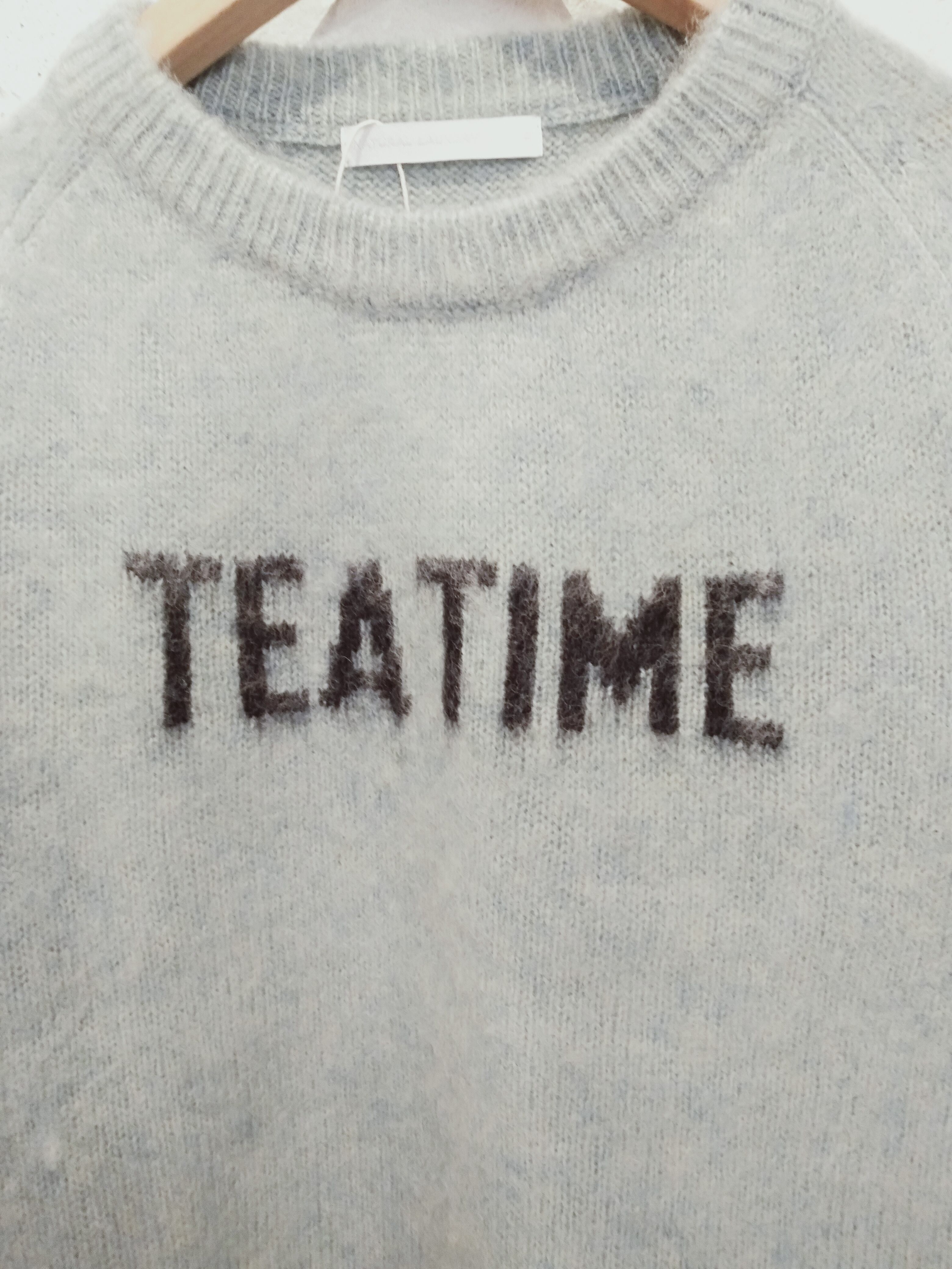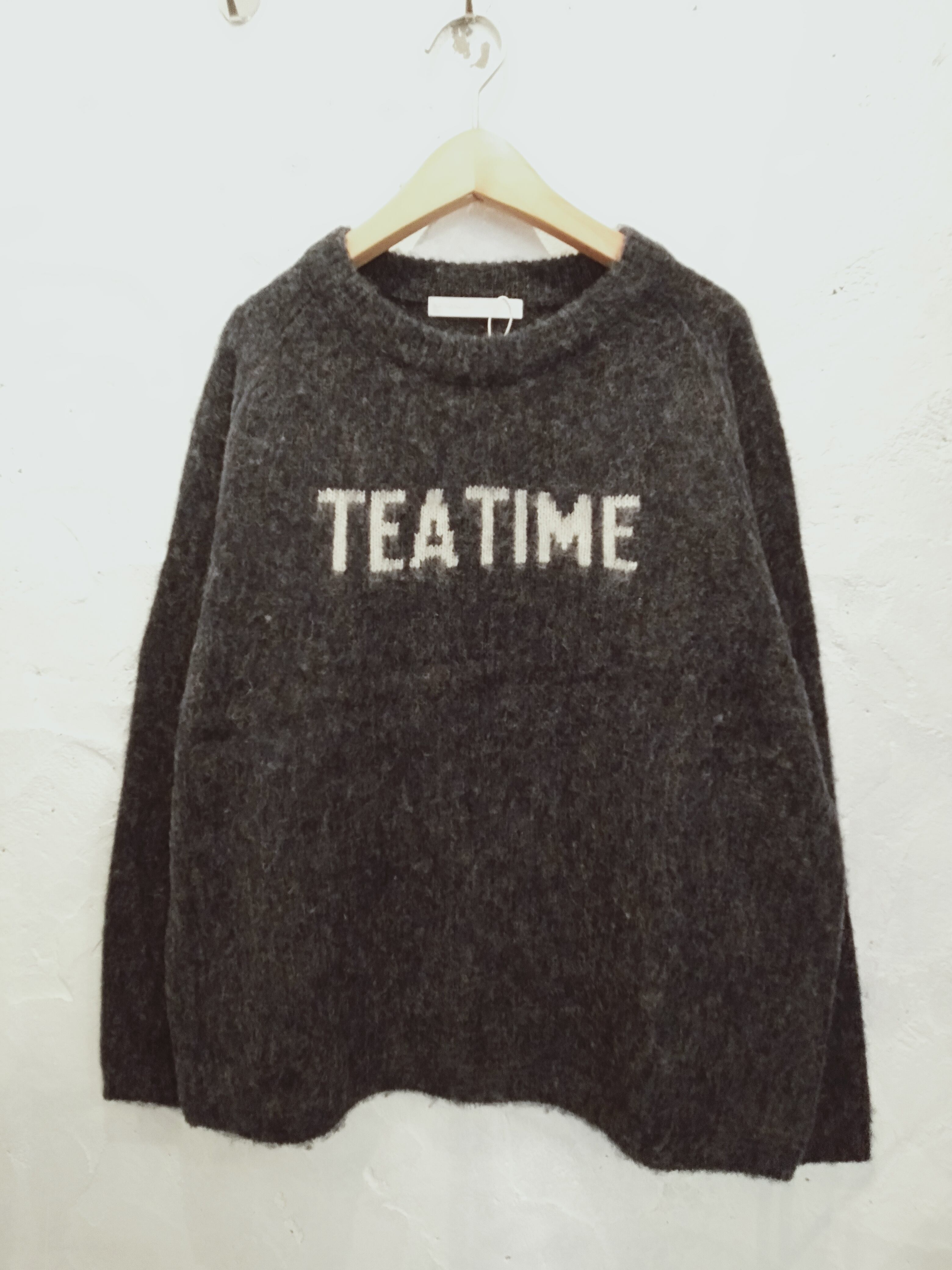 スコットランドの北部、シェットランド諸島の羊からとれるウールで保温性が高く、カラッとした肌触りが特徴です。シャギー加工を施しふわっとした風合いに仕上げました。クルーネック、ラグランスリーブのシンプルなPO。胸に編みこまれた“TEA TIME“の文字の色とボディーの色の組み合わせがgoodです。温もりを感じますね。