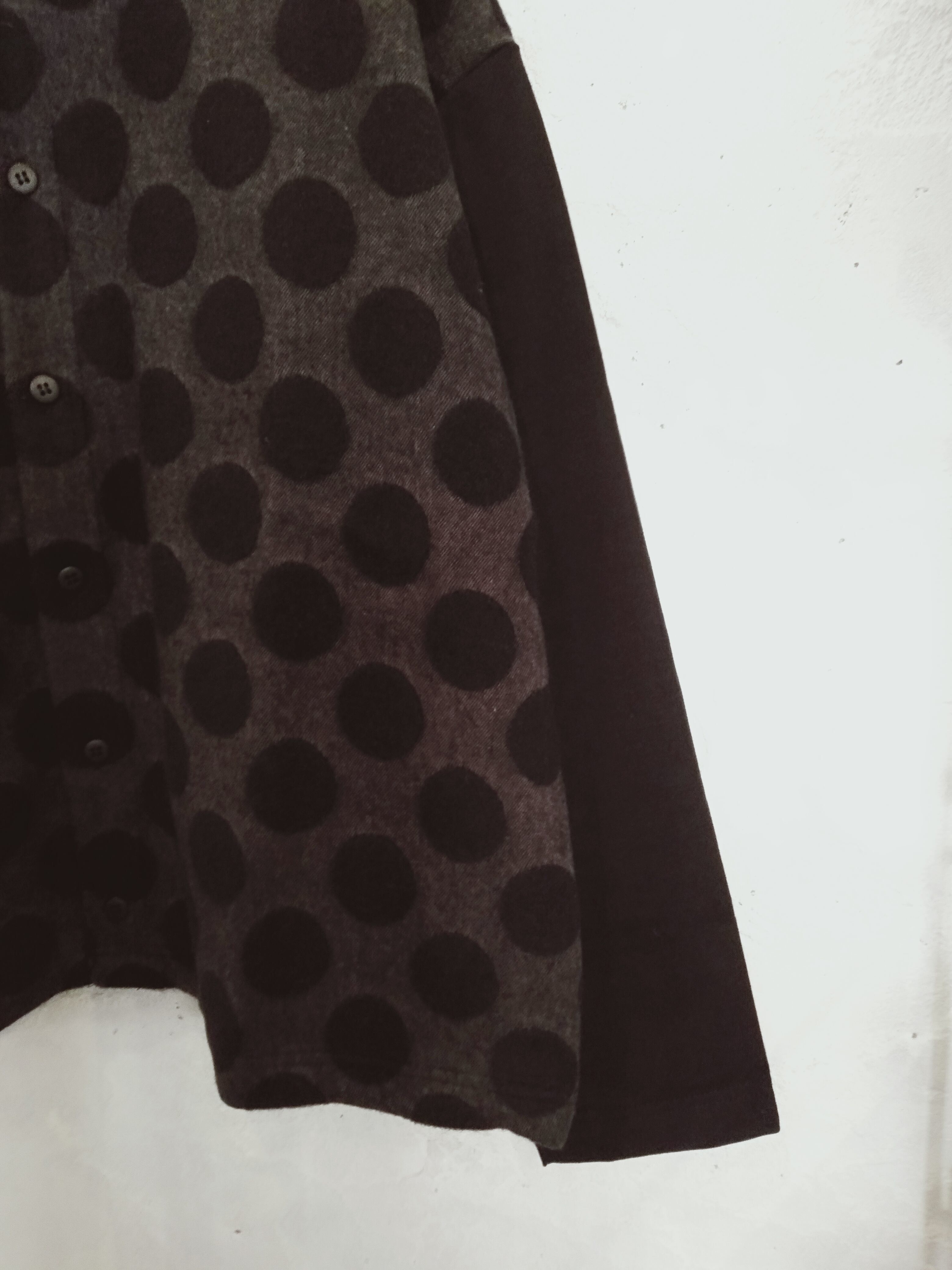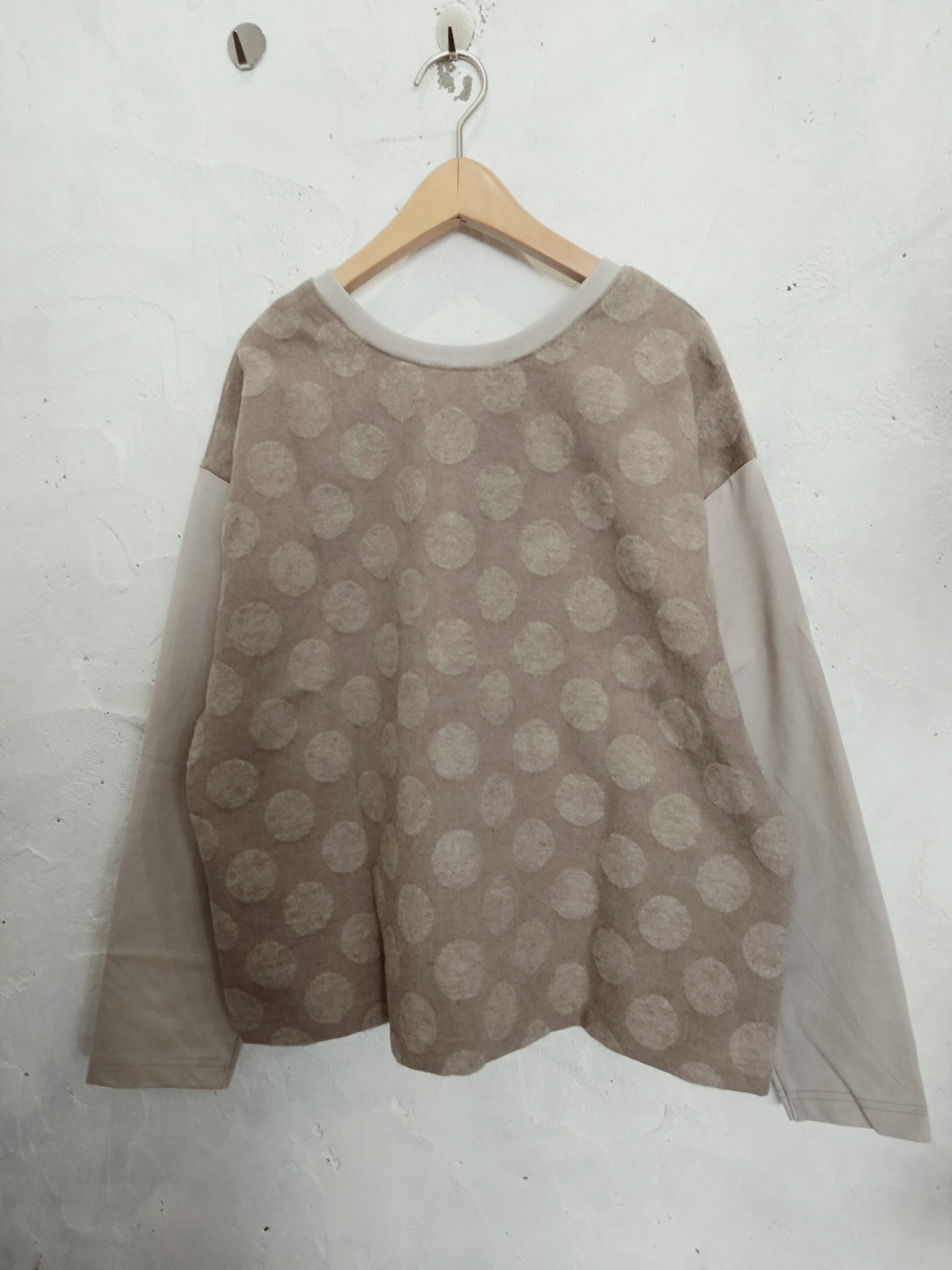 ウール混のドットジャガード生地をカットソー仕立てで作りました。同系色の配色が大人っぽい雰囲気です。カーディガンとしてもPOとしても着れる、2WAY使用のデザインです。袖の部分は無地の天竺素材になっています。